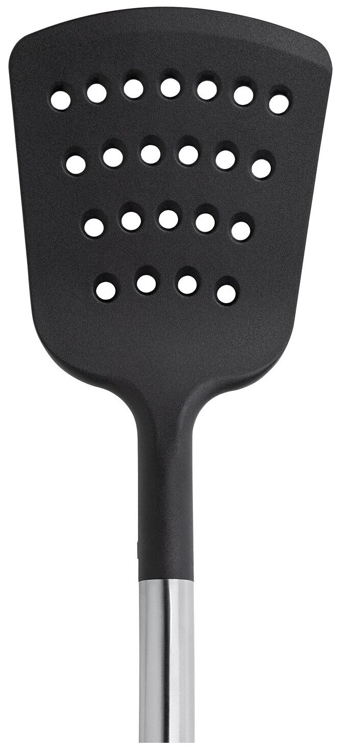 Лопатка предназначена для перемешивания продуктов в процессе варки, жарки или тушения и для подачи готовых блюд. Прорези на лопатке позволяют стекать излишкам масла, соуса или жидкостей. Изделие прекрасно подойдет для посуды с антипригарным, тефлоновым или керамическим покрытием. Рабочая часть лопатки выполнена из пищевого пластика и выдерживает температуру до 220?. Можно мыть в посудомоечной машине.