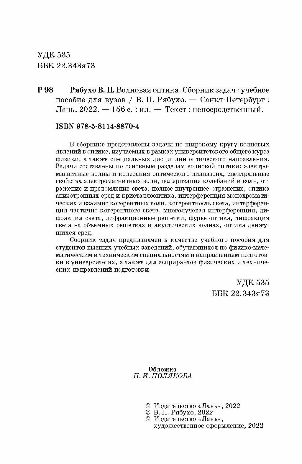 Волновая оптика. Сборник задач. Учебное пособие (В. Рябухо); Издательство ЛАНЬ, 2022