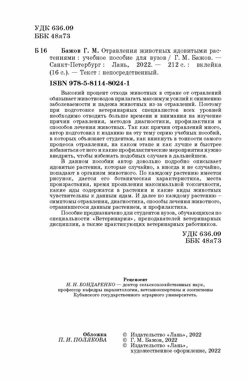 Отравления животных ядовитыми растениями. Учебное пособие (Г. Бажов); Издательство ЛАНЬ, 2022