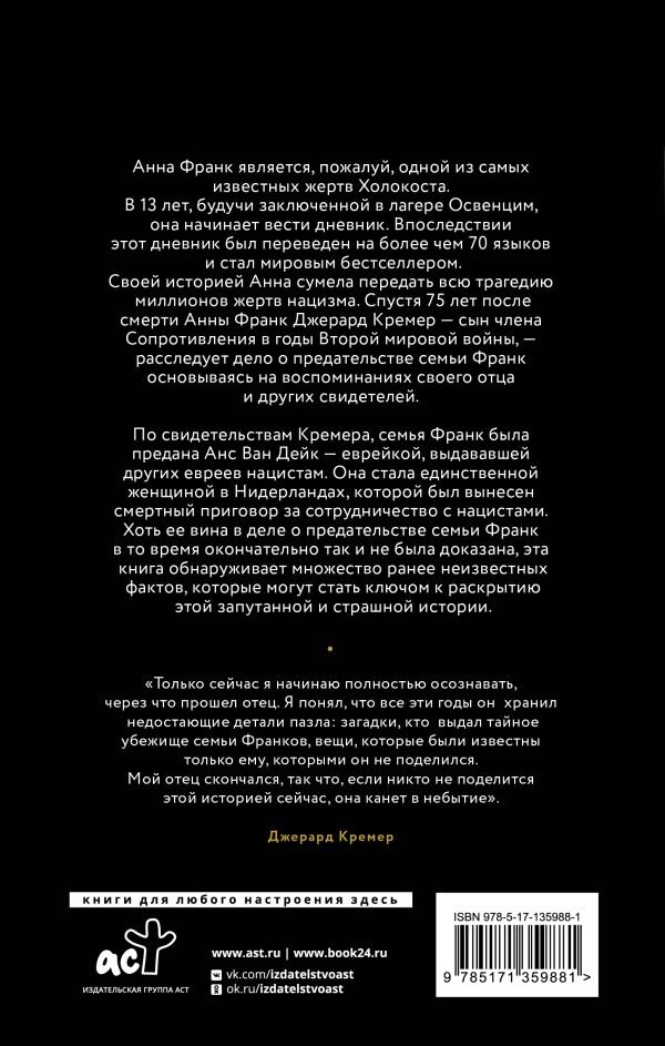 По свидетельствам Кремера, семья Франк была предана Анс Ван Дейк - еврейкой, выдававшей других евреев нацистам. Она стала единственной женщиной в Нидерландах, которой был вынесен смертный приговор за сотрудничество с нацистами. Хоть ее вина в деле о предательстве семьи Франк в то время окончательно так и не была доказана, эта книга обнаруживает множество ранее неизвестных фактов, которые могут стать ключом к раскрытию этой запутанной и страшной истории.