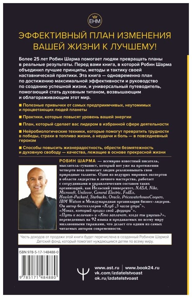 Робин Шарма - известный писатель, мыслитель-гуманист. Он входит в число ведущих консультантов по лидерству и личностной оптимизации. Его клиенты - знаменитые миллиардеры, деятели искусств, звезды профессионального спорта и многие компании из рейтинга "Fortune 100".