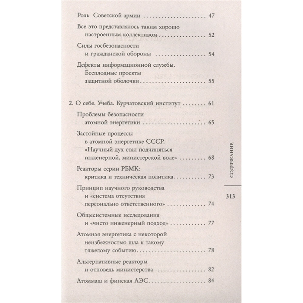 Очень интересная, на удивление лёгкая для восприятия книга, которая рассказывает о ликвидации аварии, а также о системных процессах, которые к ней привели. В ней стенограмма воспоминаний В. Легасова, его избранные статьи, а также отчёт об аварии на Ленинградской АЭС ещё в 1975 году и есть хорошая, понятная статья про работу реактора чернобыльского типа. Без надрывного трагизма и лишнего пафоса о непростой работе.