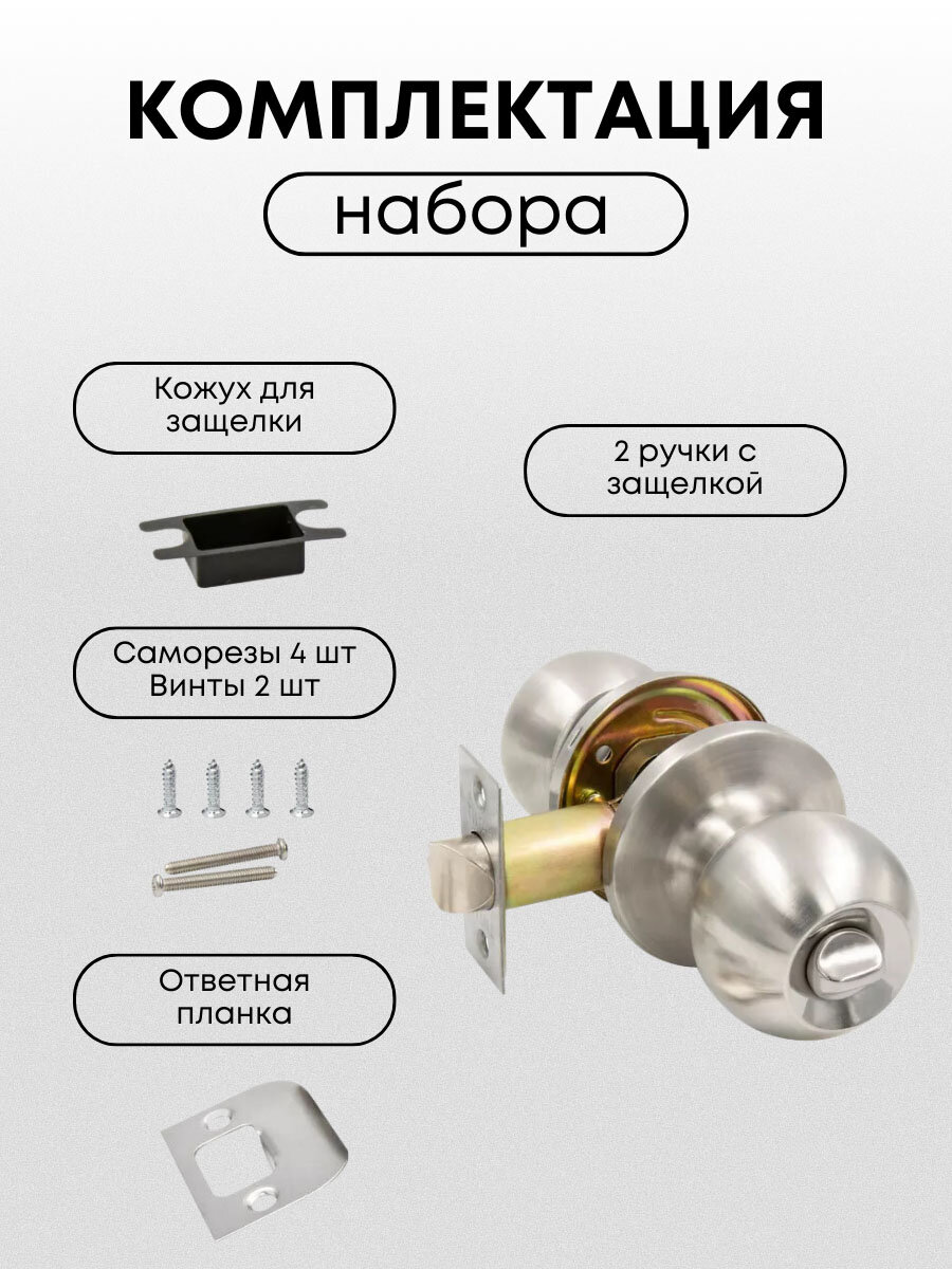 Комплект дверных ручек с защелкой - полноценное решение для комплектации межкомнатных дверей (от 35 до 45 мм толщина полотна), диаметр розетки стандартный - 65 мм. С одной стороны ручка с фиксатором, с другой стороны аварийный паз (нож для открытия ручки в комплекте). Дверные ручки с замком универсальные, подходят на левые и правые двери, можно менять стороны ручки при установке. Ручка дверная межкомнатная имеет высокий ресурс работы: более 300 000 рабочих циклов. Бэксет (удаление ключевого отверстия) защелки регулируется - 60/70 мм. Межкомнатные ручки выполнены из легких современных сплавов, покрыты гальваническим способом в 5 слоев. Данный метод покрытия предотвращает коррозию и защищает от воздействия влаги, поэтому ручки Титан можно использовать в помещениях с высокой влажностью (например, ванные и душевые комнаты). Гарантия 1 год на весь ассортимент дверных ручек Титан.