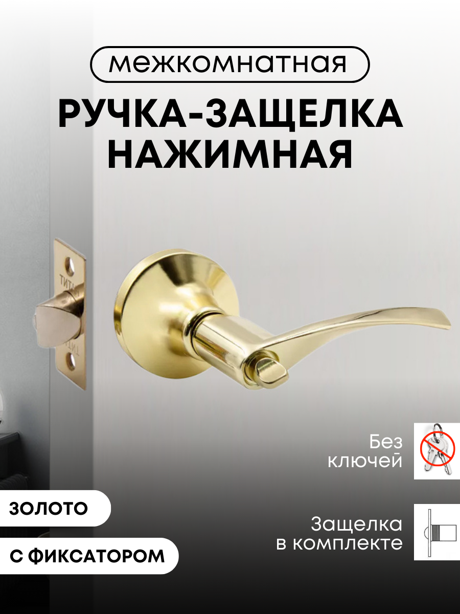 Комплект дверных ручек титан с защелкой (фиксатор, без ключей) - полноценное решение для комплектации межкомнатных дверей (от 35 до 45 мм толщина полотна), диаметр розетки стандартный - 65 мм. С одной стороны фиксатор, с другой стороны аварийный паз (открывается ножом, отверткой плоской и любым другим тонким предметом). Дверные ручки с замком универсальные, подходят на левые и правые двери, можно менять стороны ручки при установке. Ручка дверная межкомнатная имеет высокий ресурс работы: более 300 000 рабочих циклов. Бэксет (удаление ключевого отверстия) защелки регулируется - 60/70 мм. Межкомнатные ручки выполнены из легких современных сплавов, покрыты гальваническим способом в 5 слоев. Данный метод покрытия предотвращает коррозию и защищает от воздействия влаги, поэтому ручки титан можно использовать в помещениях с высокой влажностью (например, ванные и душевые комнаты). Материал изготовления: основание из стали, ручки из сплава ЦАМ (сплав цинка, алюминия, меди). Плавная работа пружины и бесшумный механизм гарантирует качественное открывание и закрывание двери. Гарантия 1 год на весь ассортимент дверных ручек титан.