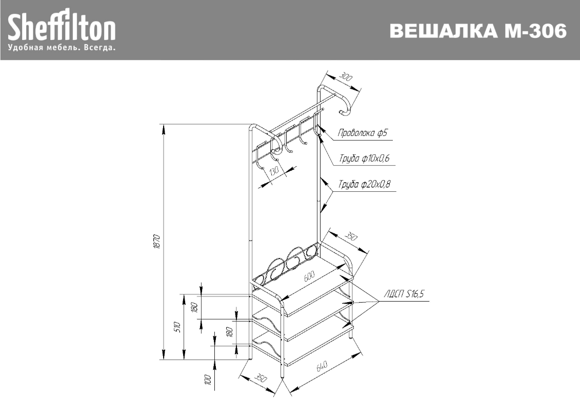 - Максимальная распределенная статическая нагрузка: на полку - 10 кг, на штангу - 8 кг, на крючок - 5 кг. - Изделие полностью разборное, что обеспечивает простоту сборки и хранения. - Гарантия 2 года.