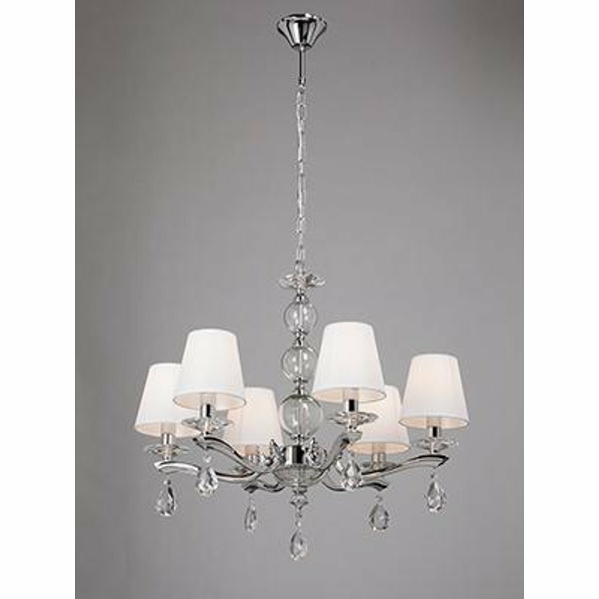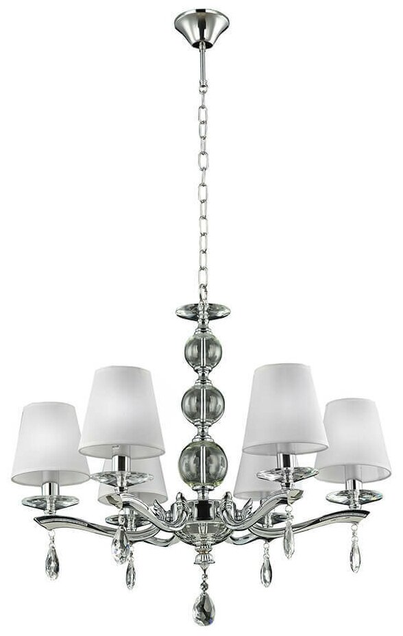Подвесная люстра V3919/6 — модель от российской компании Vitaluce. Основа Люстра выполнена из металла цвета хрома, абажур из ткани белого цвета. Люстра будет хорошо смотреться в гостиной, кухне, над обеденным столом, кабинете, даче и удачно впишется в интерьер в стиле классический. Модель имеет 6 абажуров и 6 лампочек, оснащена цоколем E14 с максимальной мощностью лампочки 40 Вт и рассчитана на освещение площади до 12 кв. м. Диаметр модели — 72 см. Степень защиты от влаги и пыли — IP20. Люстра устанавливается на металлический крюк и поддерживает подключение диммера.
