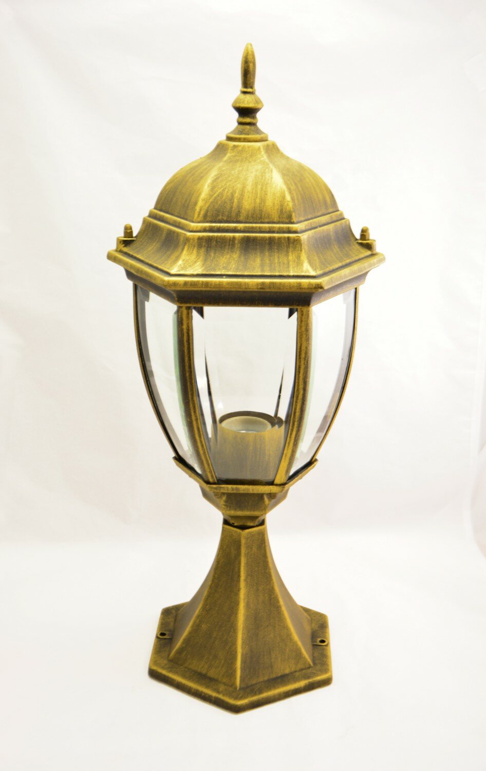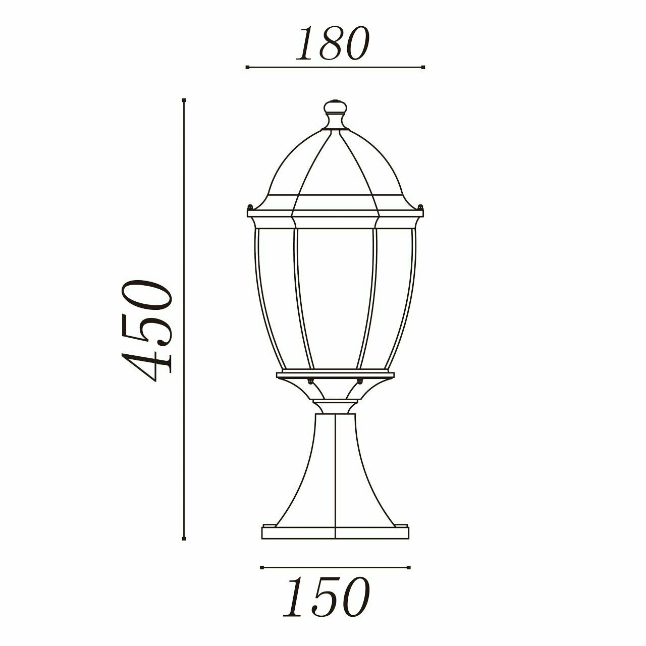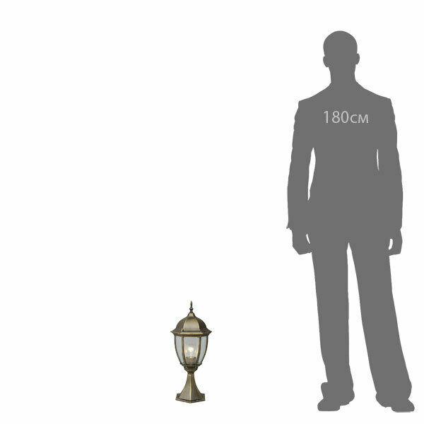 Уличный светильник из коллекции «Фабур» по достоинству оценят любители классики. Основание из алюминия цвета старинной позолоты напоминает об античных временах. Под стать ему – форма стеклянного плафона, традиционная для интерьеров дворцовых замков. Такой светильник идеально дополнит изысканный экстерьер загородного дома, дизайн которого ориентирован на благородную классику. Рекомендуемая площадь освещения порядка 5 кв.м.