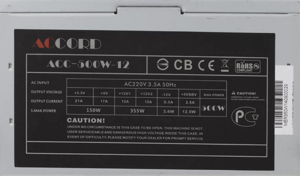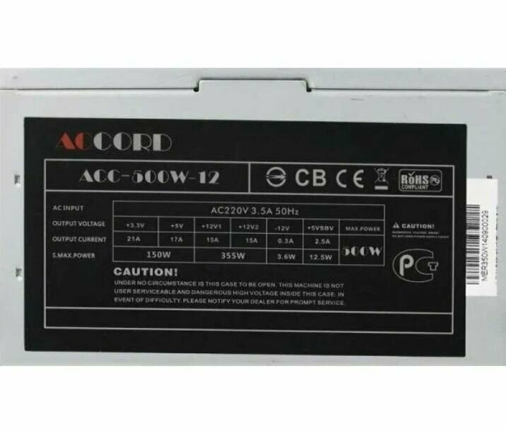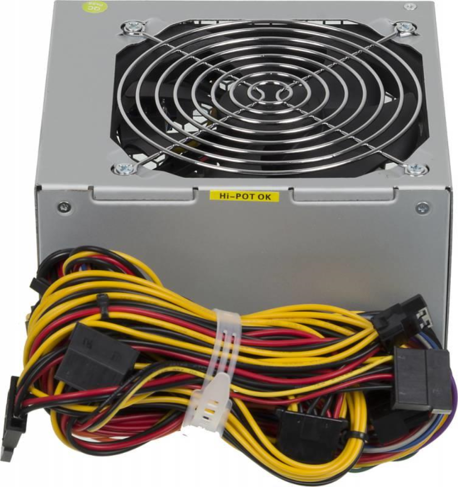 Блок питания Accord ATX 500W ACC-500W -12, дополнительные разъемы: 2 Molex, 4 SATA и 1 FDD. Охлаждение производится бесшумным кулером 120 мм, который работает достаточно эффективно благодаря большому диаметру и невысокой скорости вращения. Активный PFC.