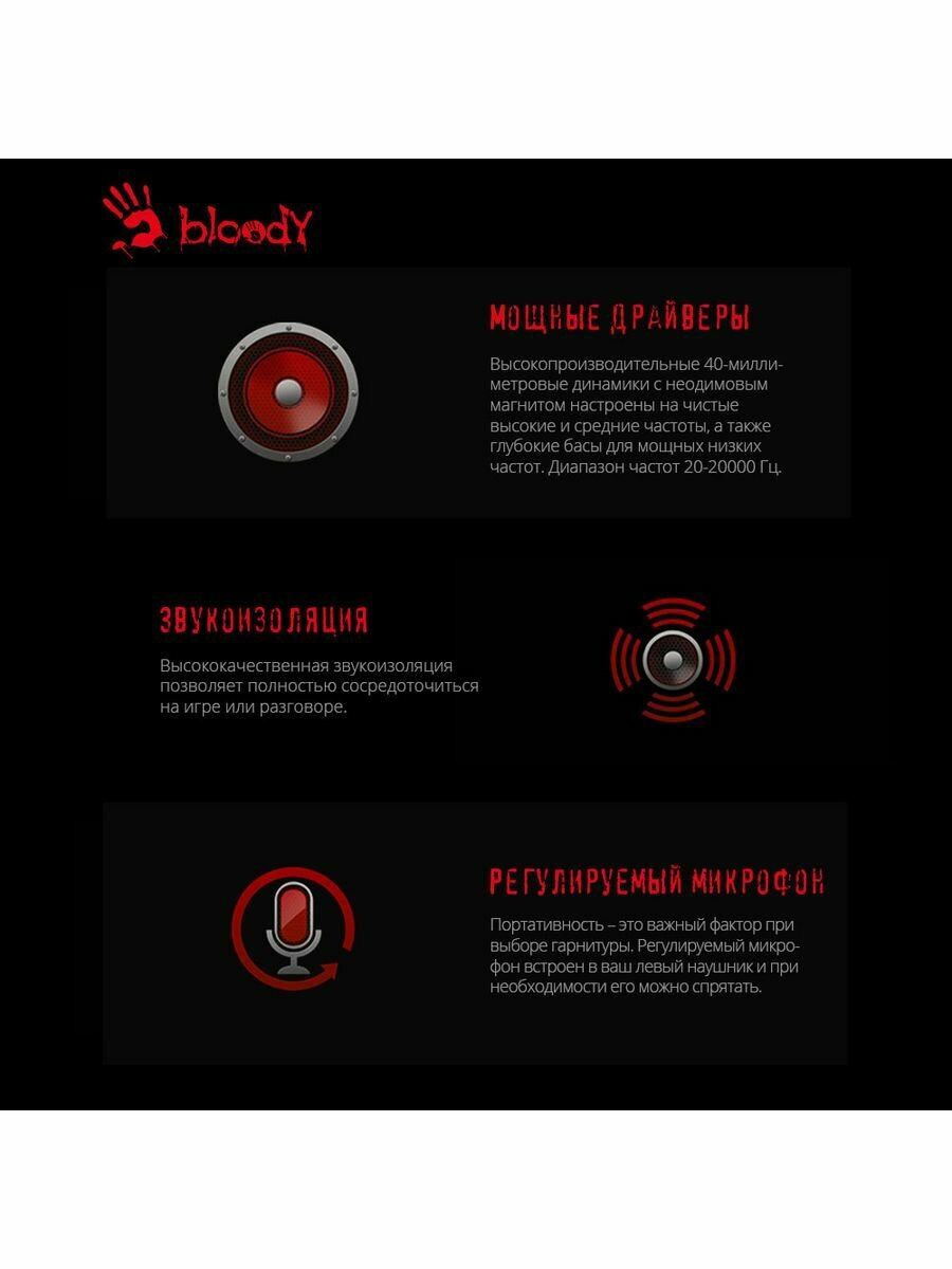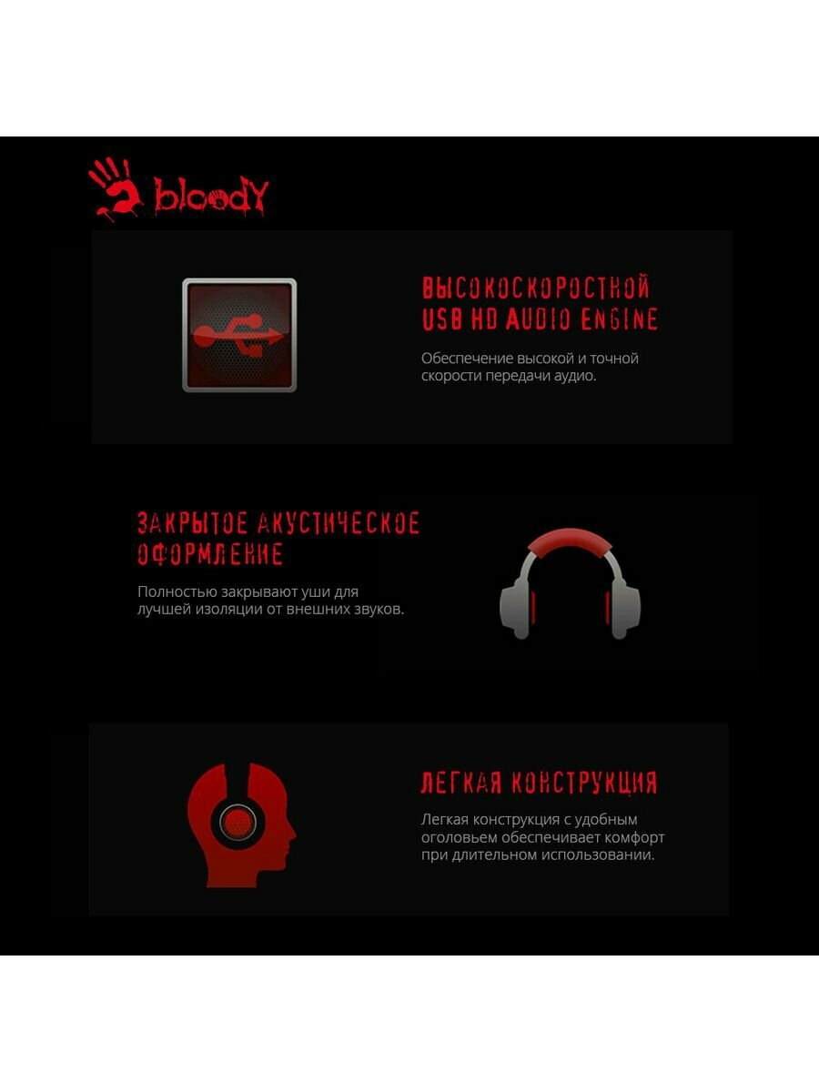 Наушники с микрофоном A4 Bloody G500 чёрно-красного цвета применяются не только для игр, но и для общения в видео-чатах, например, по скайпу. Гарнитура имеет регулируемое оголовье для максимально комфортной фиксации на голове и вращающиеся на 360º амбушюры.