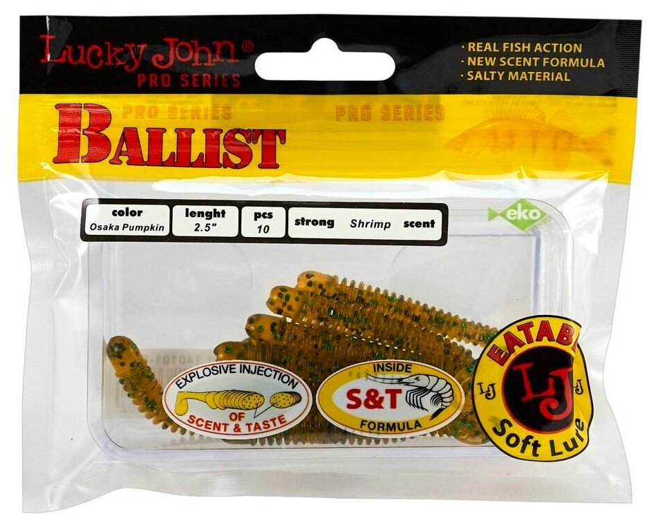 Характеристики:• Длина: 8.4 см.• Форма: червь.• Тип приманки: съедобная.• Кол-во в упаковке: 8 шт.• Цветовые оттенки: имитирующие.• Плавучесть: тонущая.• Цвет: #PA19.Твистер Lucky John BALLIST – Гибрид твистера и червя с устойчивым креветочным запахом, при этом вкусовые и ароматические вещества внедрены в состав материала приманок, а не просто нанесены сверху, что позволяет приманке сохранять привлекательность для рыбы в течение долгого времени. Приманка имеет вытянутое ребристое червеобразное тело и небольшой мягкий твистерный хвостик. Может имитировать как пиявку или крупную личинку, так и прогонистого малька. Твистер Ballist идеально подходит для разнесенных оснасток – отводного поводка, каролины или сплит-шота. Проводки возможны самые разные – от медленной равномерной до подобия твитчинга с резкими рывочками. Неплохо работают эти приманки и на микроджиге с обычной ступенчатой проводкой или с волочением приманки по дну. Все съедобные приманки Lucky John Pro Series продаются в надежных пластиковых пакетах с застежками zip-lock, защищающих их от воздействий внешней среды и позволяющих дольше сохранять запах. В этих пакетах их лучше и хранить на рыбалке.