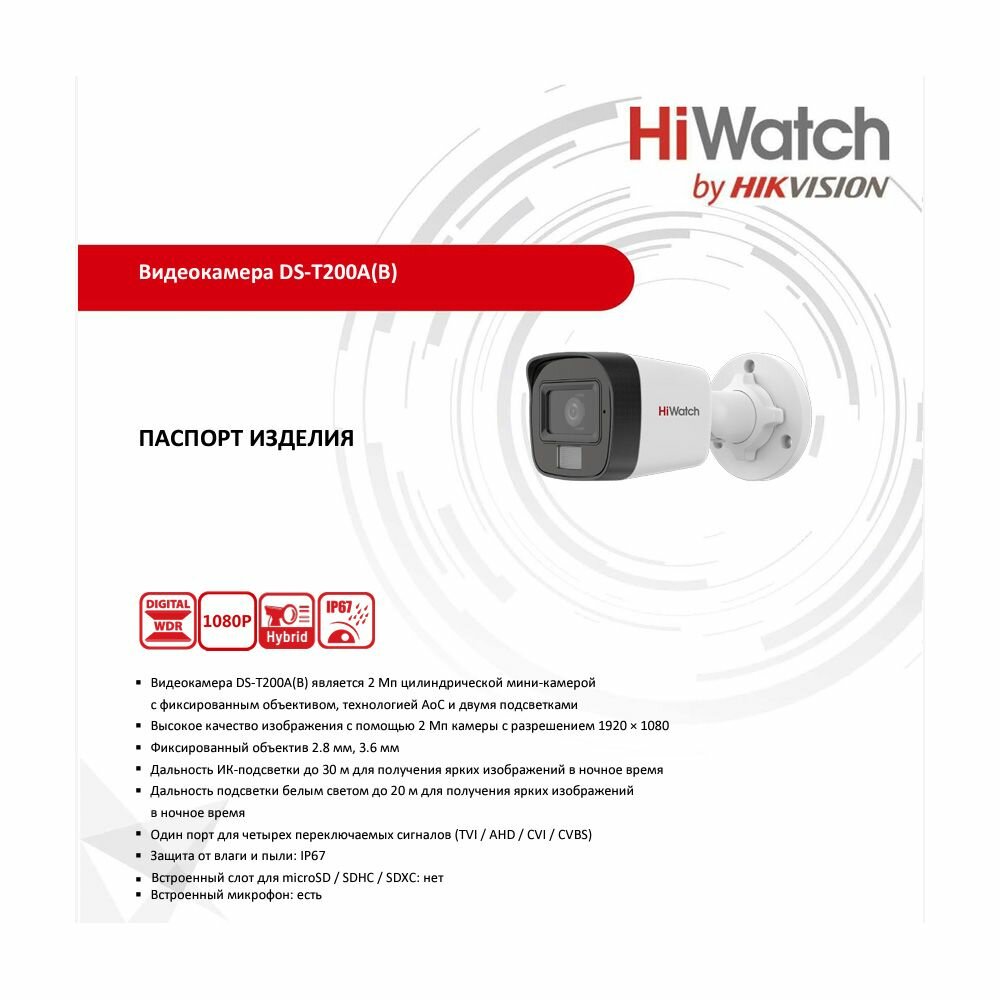 HiWatch DS-T200A - уличная цилиндрическая HD-TVI камера с EXIR-подсветкой до 30 м. Имеет особенности: разрешение 2 Мп, защита от пыли и влаги IP66, объектив 2.8 мм, видеовыход 4-в-1 (TVI, AHD, CVI, CVBS), режим «День/ночь». Встроенный микрофон позволяет записать окружающие звуки.