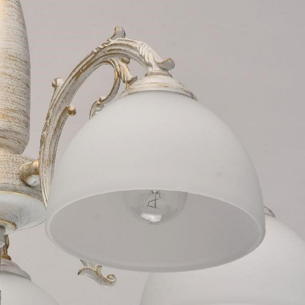 Люстра из коллекции Ариадна выполнена в стиле легкой ковки, благодаря чему светильник выглядит особенно оригинально. Молочно-белое основание из металла дополнено эффектом патины в цвет золота, что привнесет в обстановку комнаты дух благородной старины. Необычное основание выгодно сочетается с традиционными, направленными вниз плафонами из матового белого стекла. Несмотря на свою кажущуюся простоту, они придают люстре особый колорит, и освежают интерьер ослепительной белизной. Завершает композицию изящная деталь - подвес из прозрачного декоративного стекла.