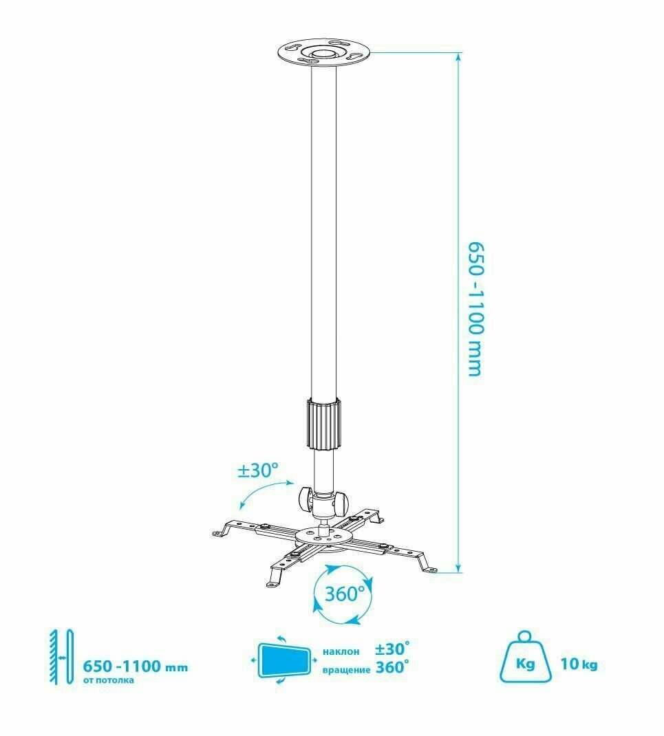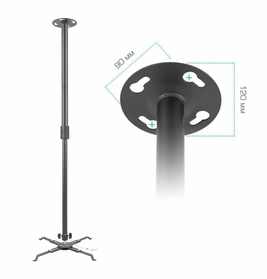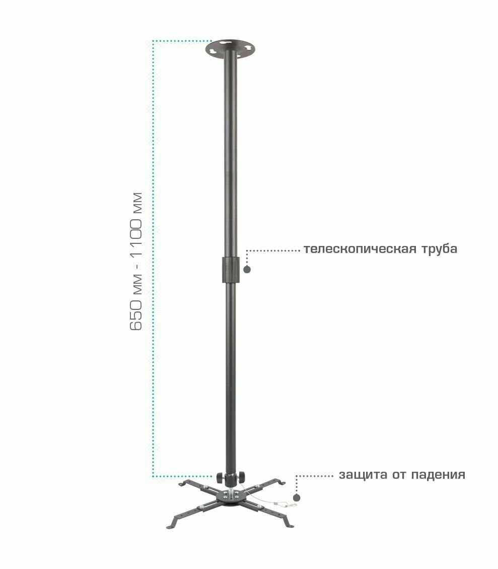| Дополнительно | Надежная стальная конструкция , Универсальная система крепления , Плавная регулировка положения проектора по высоте , Удобна регулировка наклона и вращения , Защита от падения |