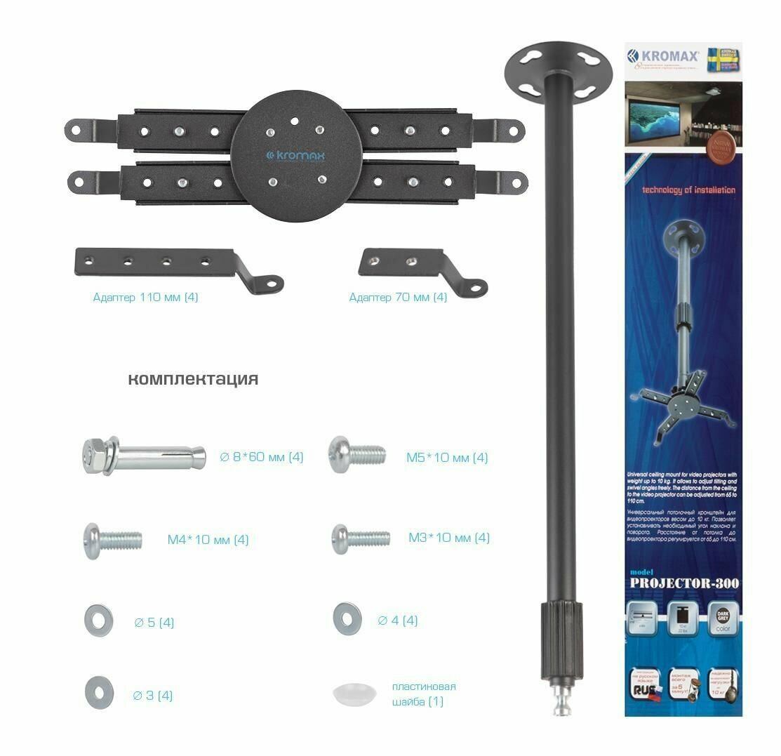 Kromax Projector-300 – это потолочное крепление, которое предназначено для видеопроекторов. Возможность регулировать расстояние, наклоны и поворот Kromax Projector-300 делает данную модель надежной и многофункциональной в работе. Совместимо с большинством видеопроекторов. Максимальное и минимальное расстояние до стены составляет от 1000 мм до 650 мм.