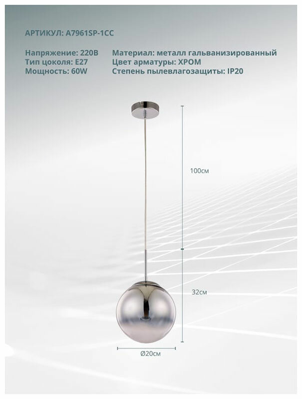 Необыкновенная модель A7961SP-1CC от итальянской компании Arte Lamp относится к коллекции Jupiter Chrome и отлично подойдет для установки на потолок кухни, оформленной в современном стиле. подвес светильник Arte Lamp Jupiter Chrome A7961SP-1CC с плафонами в виде шаров осветит помещение площадью 2 кв. м. Производитель Arte Lamp рекомендует использовать для устройства лампы накаливания с цоколем E27 и мощностью 60 W. Прибор произведен с использованием материалов: стекло и металл и может использоваться для натяжного потолка. Основным цветом товара является хромовый и прозрачный.