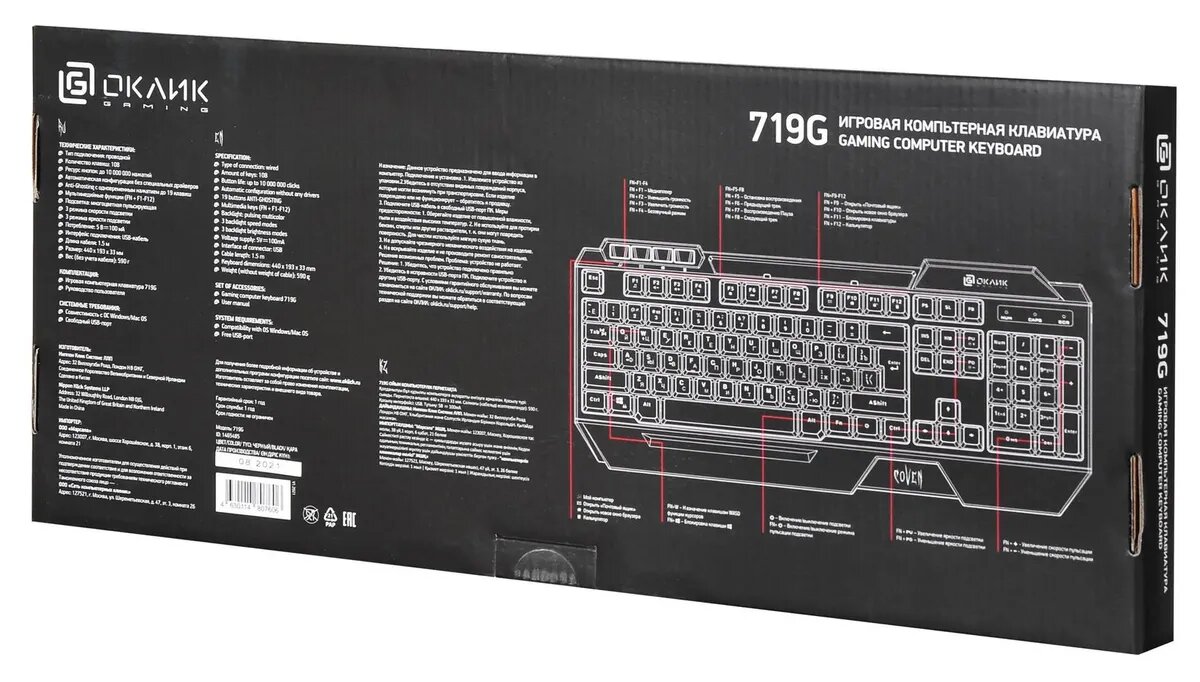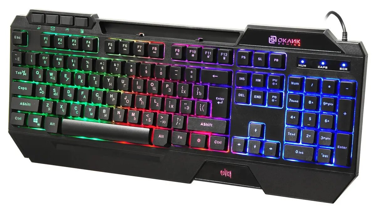 Oklick 719G COVEN (1465485) – игровая компьютерная клавиатура, предназначенная для ввода информации и передачи команд компьютеру. Ресурс нажатий кнопок составляет до 10 млн. Данная модель обладает автоматической конфигурацией без специальных драйверов. Поддерживает 3 режима скорости и 3 режима яркости подсветки.