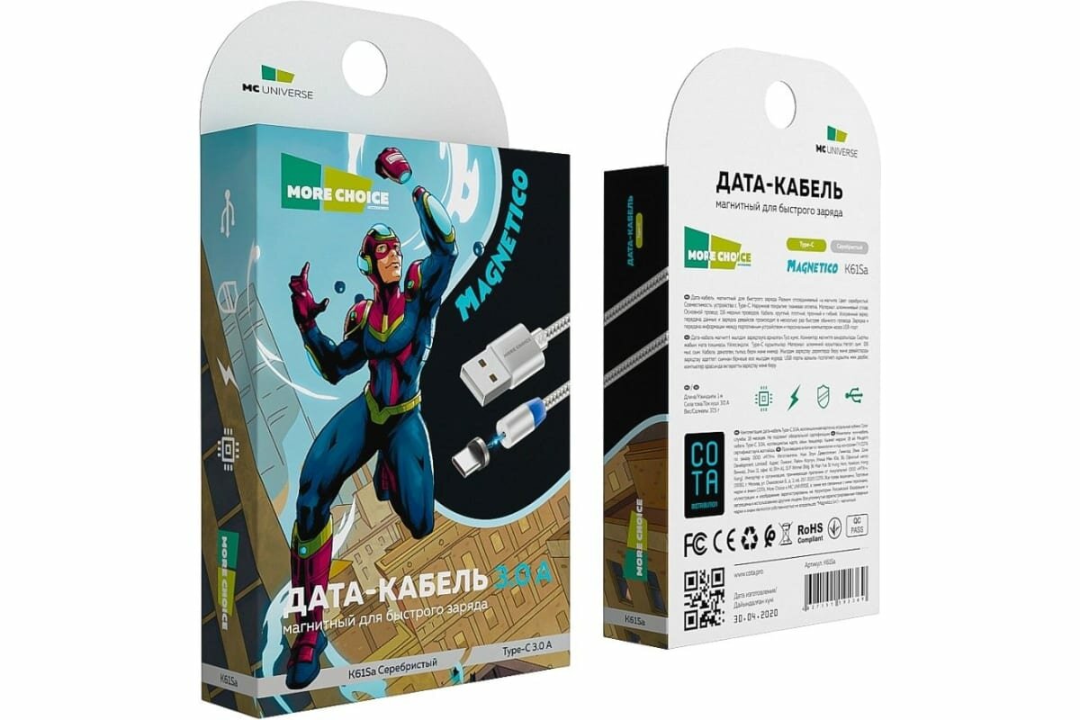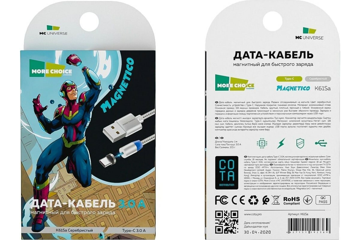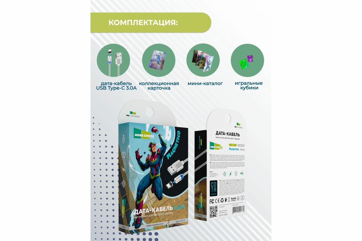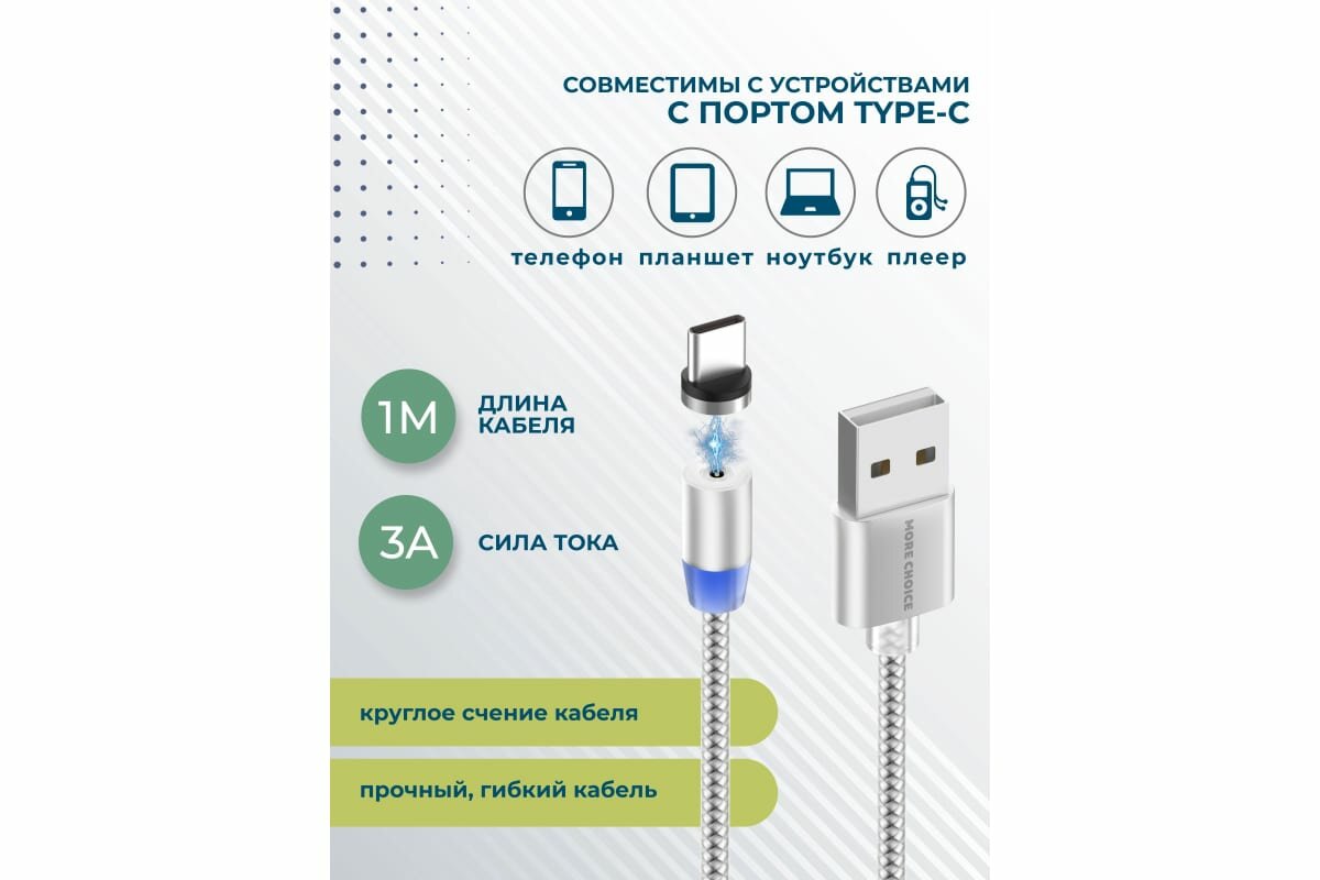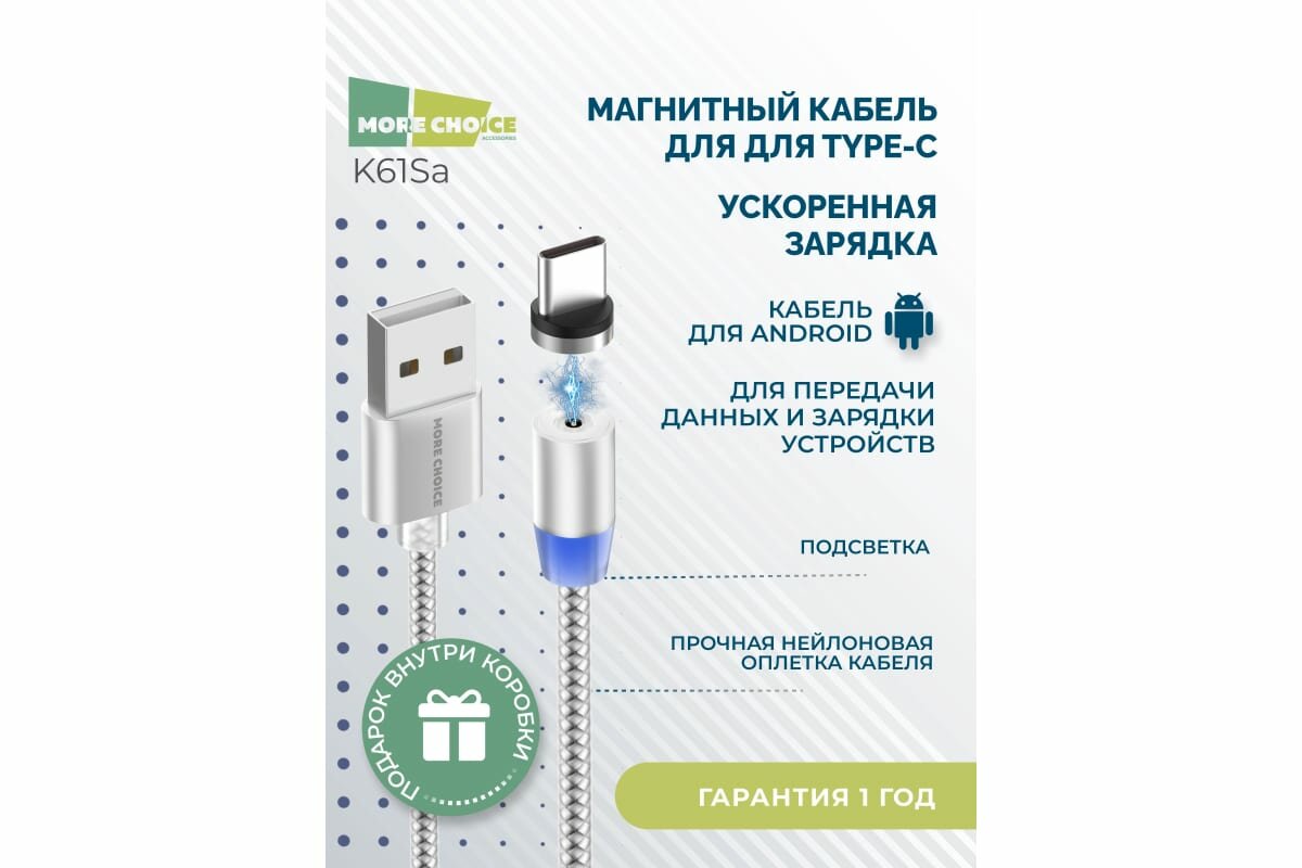 Кабель More choice K61Sa 1м Silver Smart USB 3.0A для Type-C Magnetic серебряный K61Sa Smart USB 3.0A для Type-C Magnetic 1м (Silver)