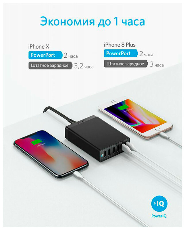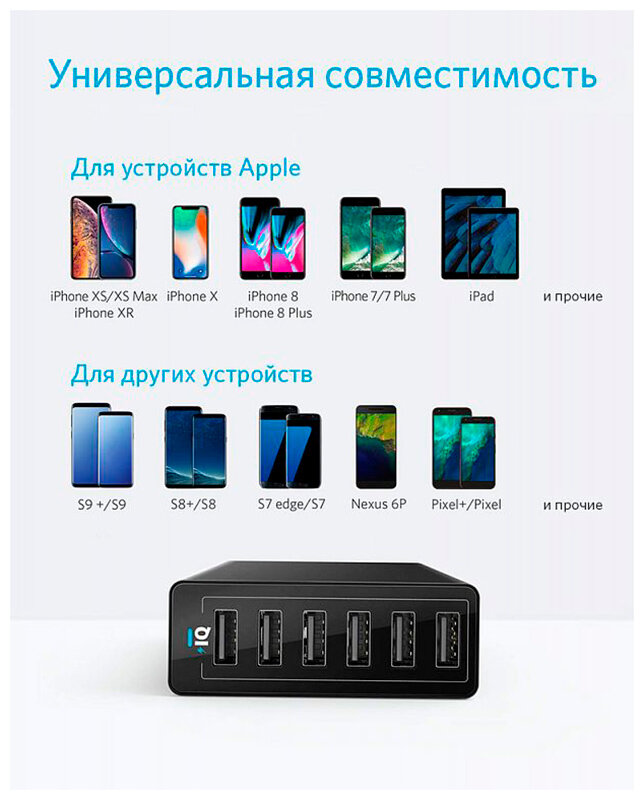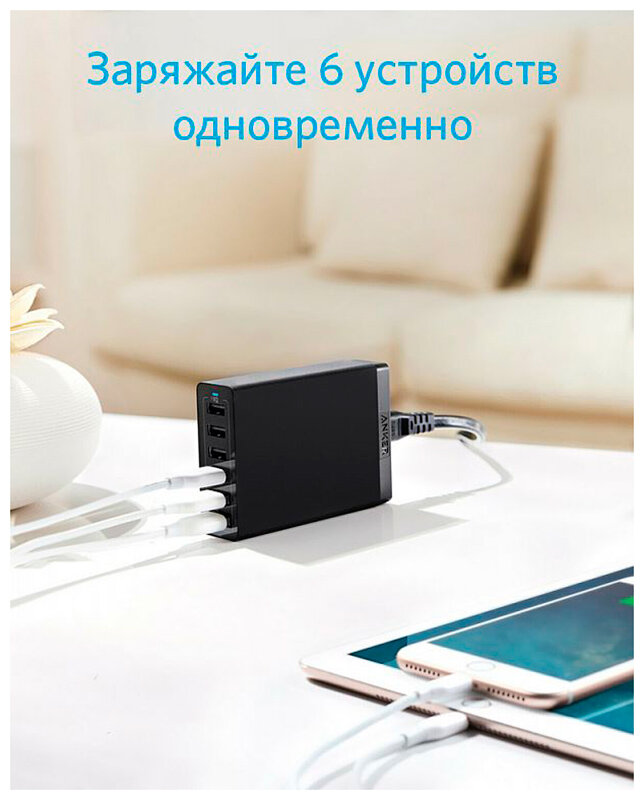 Ультра мощный. 6 портов выдают 60 Вт мощности, что позволяет одновременно заряжать несколько устройств. Современные технологии зарядки. Технологии PowerIQ и VoltageBoost вместе обеспечивают максимально быструю зарядку - до 2, 4 А на каждый порт или до 12 А в целом (не поддерживает Qualcomm Quick Charge). Безопасность. Система безопасности Anker MultiProtect – это защита от перенапряжения, контроль температуры и другие функции безопасности для вас и ваших устройств. Супер-компактный. Anker PowerPort 6 - один из самых компактных многопортовых USB-зарядных устройств на рынке.