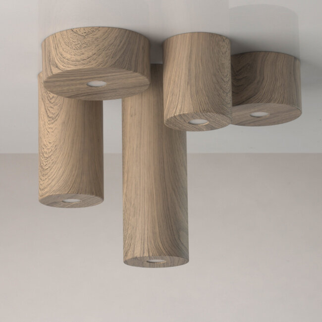 Стильный потолочный светильник прекрасно подойдет для создания точечной направленной подсветки в интерьерах с различным стилевым решением: от минимализма до эко-стилистики. Основание и плафон выполнены из металла и декорированы оригинальным рисунком, имитирующим фактуру натурального дерева. Есть две цветовые вариации - оттенка светлого и темного дерева, а значит, можно подобрать модель, идеально подходящую интерьеру по цветовой палитре. Источники света-светодиоды скрыты под вставкой из матового акрила. Широкая семья позволяет использовать светильники в комплексе, комбинируя их по высоте и цвету, благодаря чему можно создать по-настоящему эффектную подсветку.
