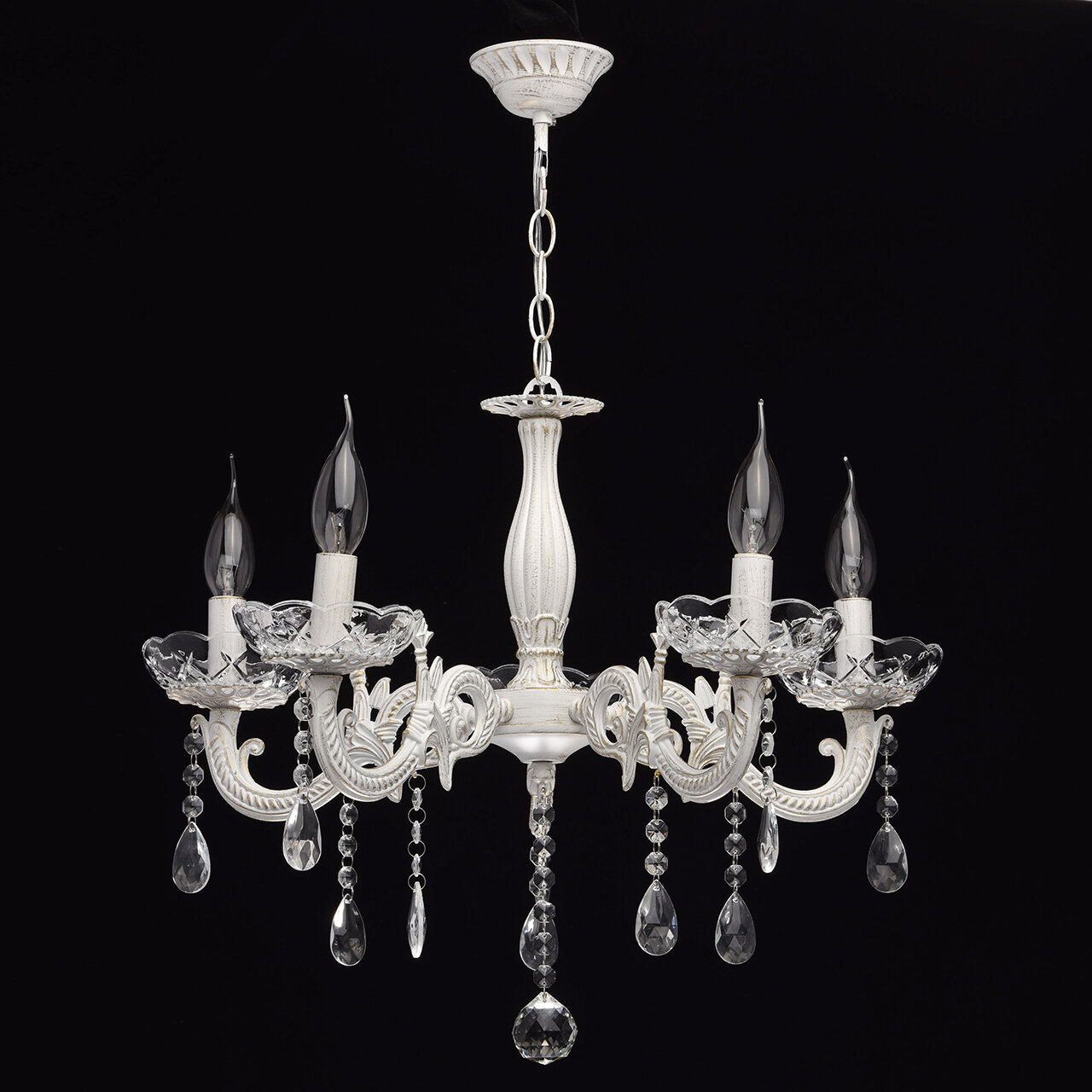 Изящные завитки и грациозная красота отличают люстру из коллекции Аврора. Металлическое основание белого цвета дополнено эффектом золотистой патины. Плавные изгибы рожка декорированы резными элементами, а крупные подвесы из прозрачного стекла подчеркивают торжественный вид. Каждая деталь смотрится гармонично, в том числе, чаши-розетки из стекла, выполненные в лучших классических традициях.