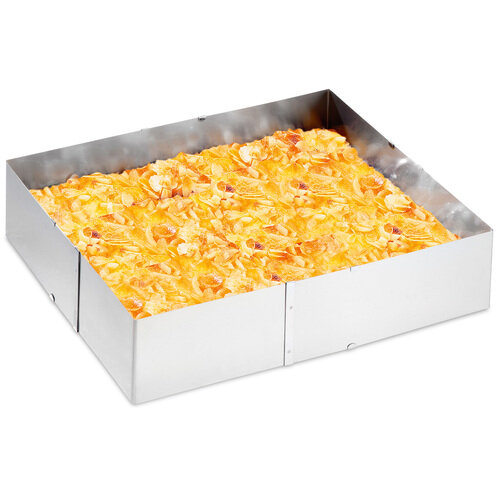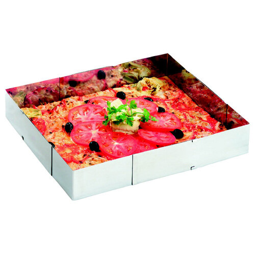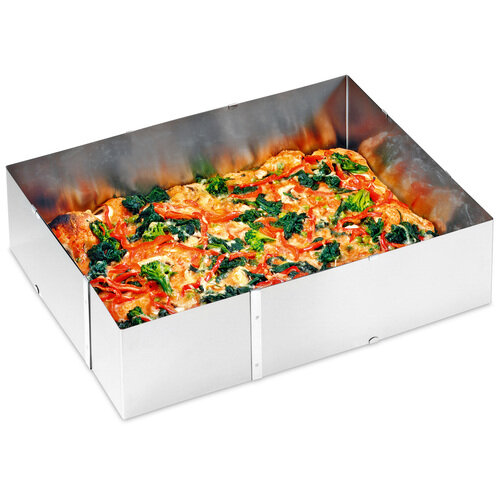 Регулируемая по размерам рамка для выпечки УНО изготовлена из нержавеющей стали и очень легко очищается от остатков пищи. Высокие бортики не дадут убежать тесту во время выпечки. Также рамку УНО зачастую используют для формирования многослойных салатов.