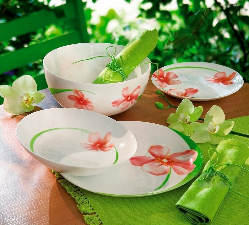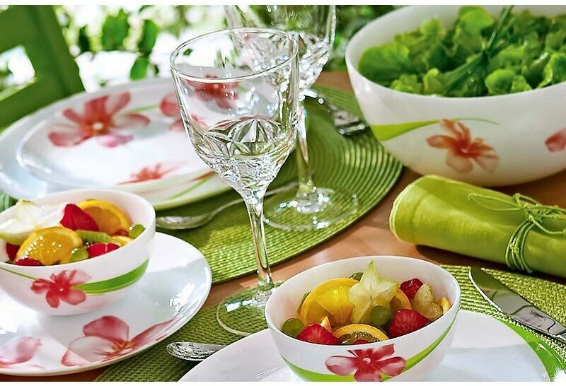 Столовый сервиз Sweet Impression E4946 из 19 предметов на 6 персон. Сервиз изготовлен из ударопрочного стекла белого цвета с цветным рисунком. В сервиз входят 6 тарелок обеденных диаметром 25см., 6 десертных тарелок 18см., 6 тарелок глубоких 20см. и средний салатник 21см.