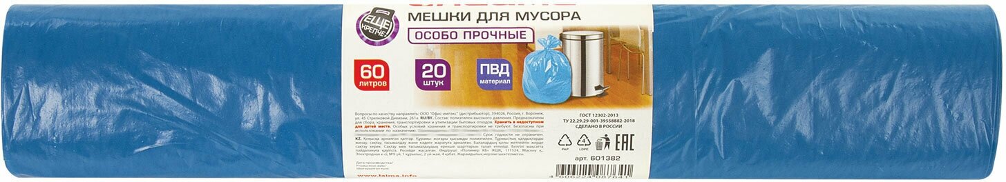 Сервис сравнения цен СкидкаГИД предлагает сравнить цены на товар «Мешки д/мусора 60л синие в рулоне 20шт ПВД 30мкм 60х70см(±5%) особо прочные ЛАЙМА 601382 5шт/уп.»