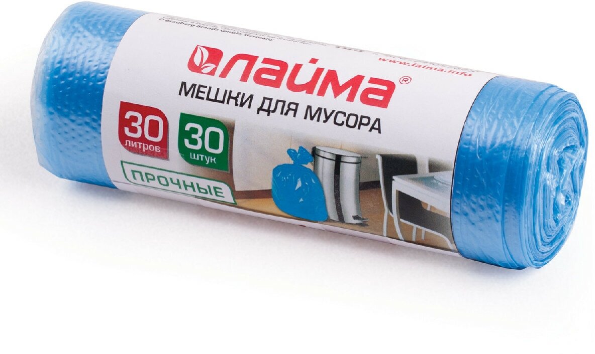 Мешки д/мусора 30л синие в рулоне 30шт ПНД 10мкм 50х60см(±5%) прочные ЛАЙМА 601378 10шт/партия