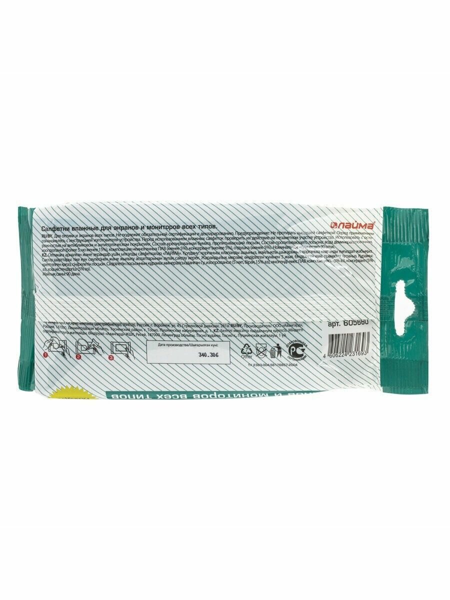Влажные салфетки ЛАЙМА подходят для мониторов всех типов, очков и объективов, эффективно удаляют пыль и загрязнения. Перед применением слегка проветрить, чтобы салфетка не была слишком влажной. Идеальны для обычной влажной уборки любых поверхностей. Благодаря специальной формуле пропитки, не оставляют разводов. Обеспечивают длительный эффект чистоты. Обладают антибактериальным эффектом и нейтральным запахом. Размер салфетки в развернутом виде - 150х180 мм. 90 штук в упаковке.