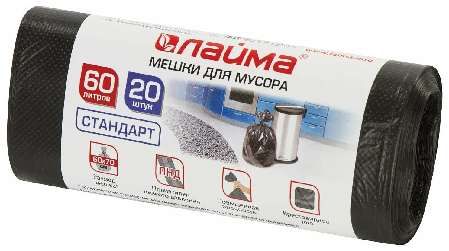 Мешки для мусора ЛАЙМА в рулоне предназначены для сбора, хранения, транспортировки и утилизации бытовых отходов. Широко используются в офисах, дома, в строительной, медицинской сфере, супермаркетах или на улице, в специальных урнах для мусора. Изготовлены из полиэтилена низкого давления (ПНД) плотностью 10 микрон и имеют объем 60 литров. Размер мешка - 60х70 см (±5%). Поставляются в рулоне по 20 штук. Преимуществами данных мешков для мусора являются: высокая грузоподъемность.