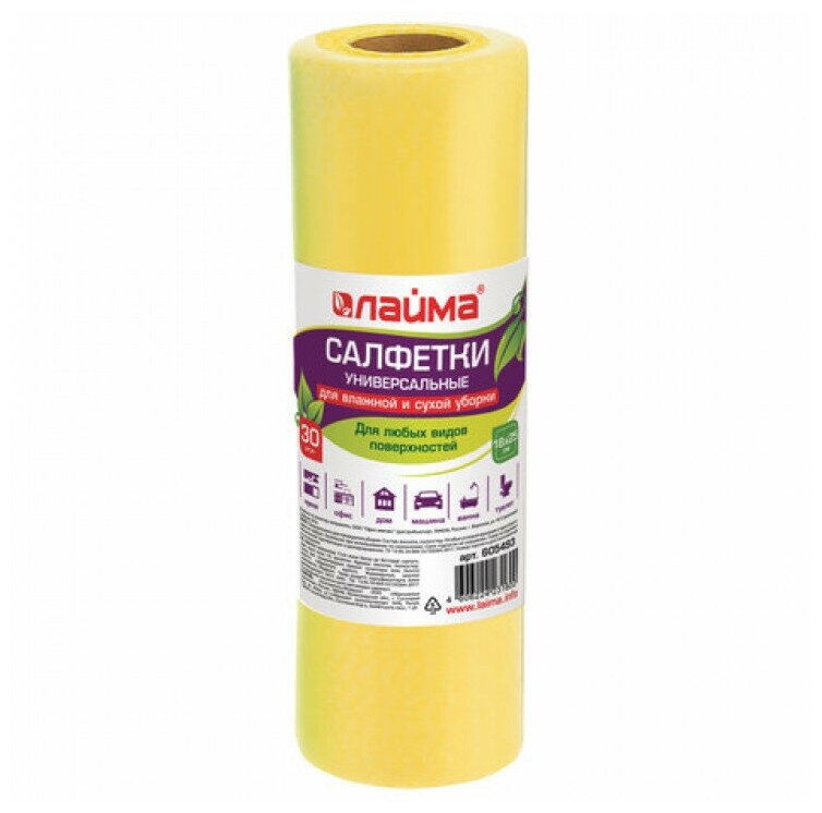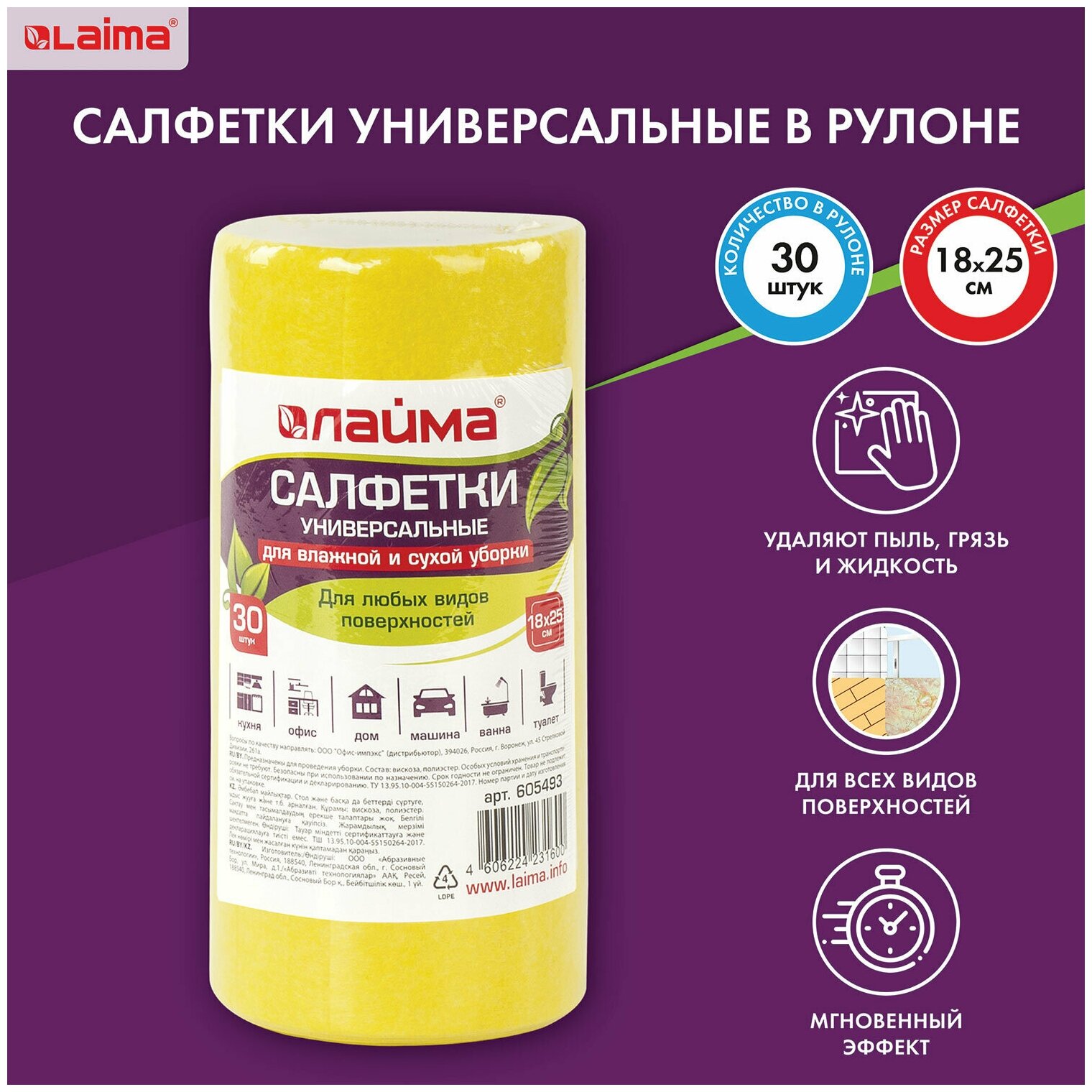 Салфетки универсальные в рулоне 30шт 18х25см вискоза (ИПП) 80 г/м2 желтые ЛАЙМА 605493