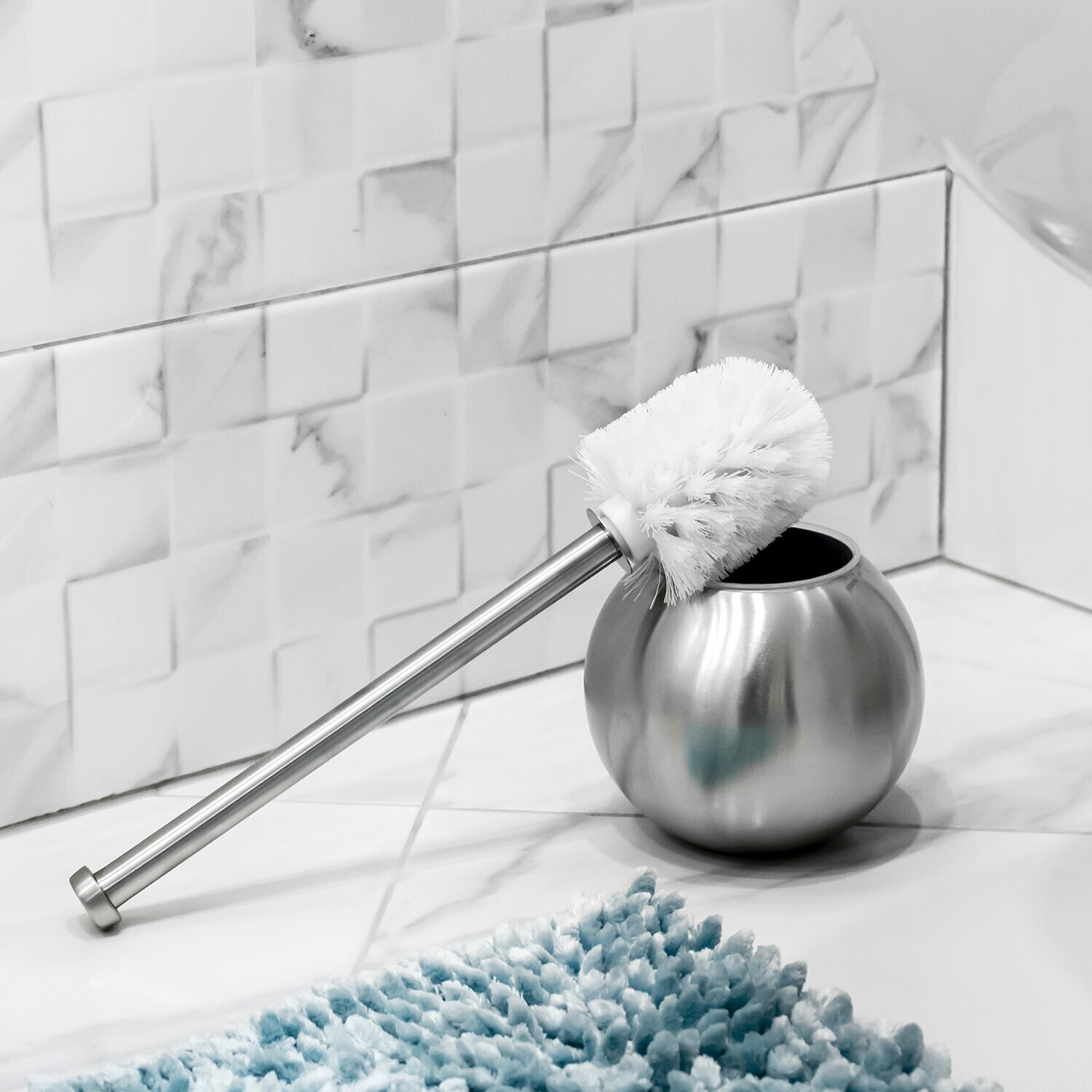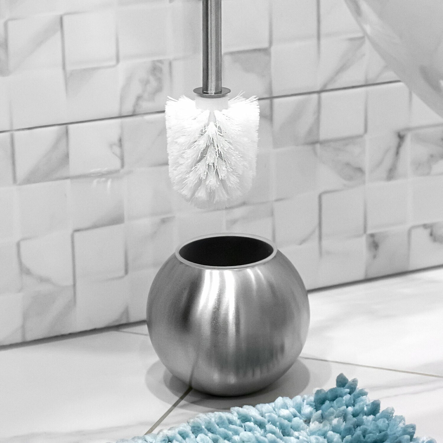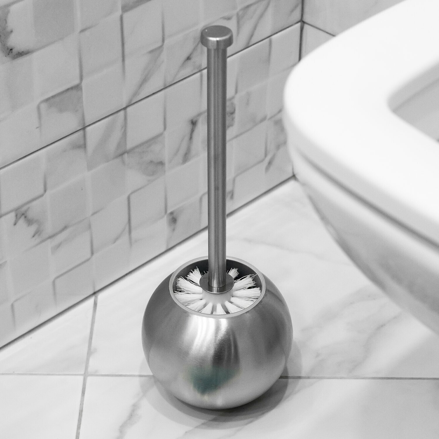Ерш изготовлен из нержавеющей стали. Оригинальная подставка в форме шара идеально впишется как в классический, так и в дизайнерский интерьер. В последнее время ерш для чистки унитаза стал обязательным элементом любой туалетной комнаты, который нужен для поддержания санитарии и чистоты в санузле. Ершик для унитаза – это щетка из искусственных волокон, которая закреплена на ручке длиной до 60 см. Комплектуется подставкой.