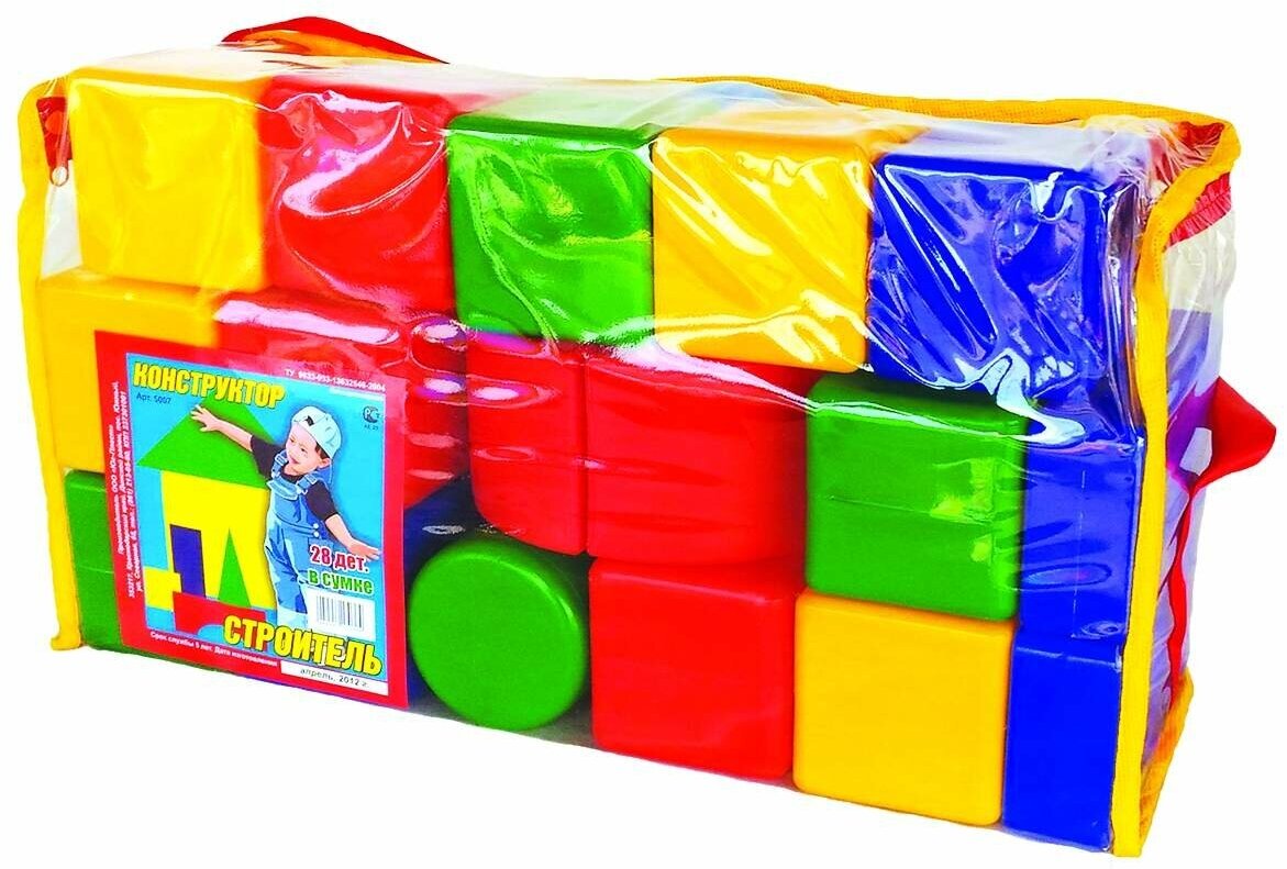 Пластмассовый конструктор из крупных деталей разной формы. В состав конструктора входят: кубики, кирпичики, цилиндры, конусы, арки, шары. Размер кубиков 7, 5х7, 5х7, 5 см. Конструктор может стать первым конструктором малыша. Детали конструктора мягкие и легкие (полые внутри), углы скруглены. Конструктор упакован в сумку из прозрачного полиэтилена. В ней конструктор удобно хранить и переносить.