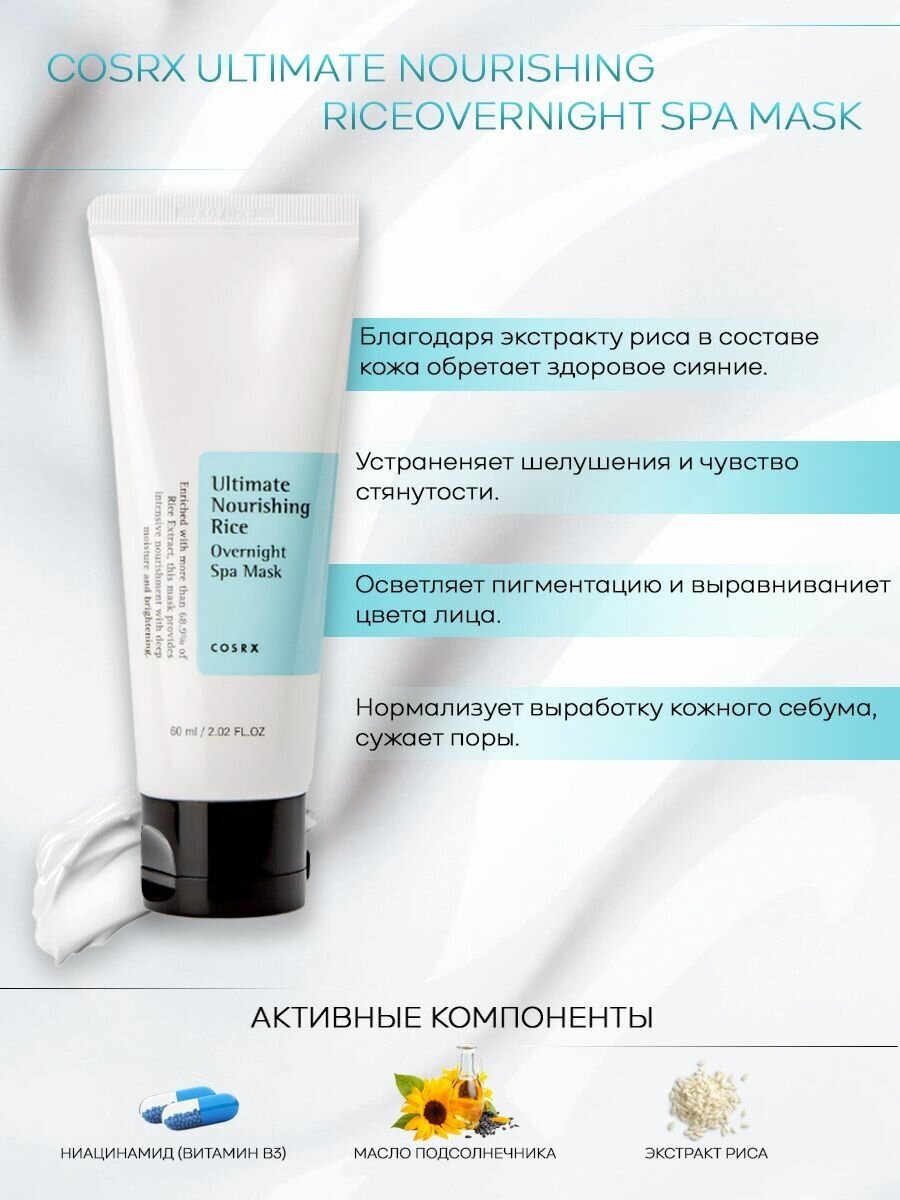 Ночная маска для лица с рисом обеспечивает интенсивное питание и смягчение кожи, устраняет шелушение и чувство стянутости, осветляет пигментацию и выравнивает тон.