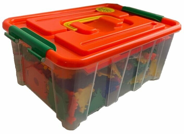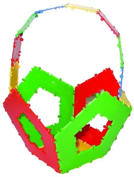 Основа конструктора - плоские пластмассовые детали различной формы (треугольники равносторонние, равнобедренные и прямоугольные, квадраты, прямоугольники, ромбы, параллелограммы, трапеции, пятиугольники, шестиугольники и восьмиугольники) и размера (длина стороны 5 и 10 см). Детали конструктора соединяются между собой с помощью шарнирных соединений (шарообразный выступ защелкивается в круглую выемку), позволяющих одной детали вращаться вокруг другой. В результате для ребенка становится наглядным процесс перехода из плоскости в пространство, от развертки - к объемной фигуре и обратно. Кроме того, появляется возможность конструирования бесконечного множества игровых фигур (от дорожки и забора до коттеджа, ракеты, корабля и т.п.) и геометрических объемных фигур (от трех-, четырех-, пяти-, шести-, восьмигранных призм и пирамид- до икосаэдров, додекаэдров и звезд Кеплера).