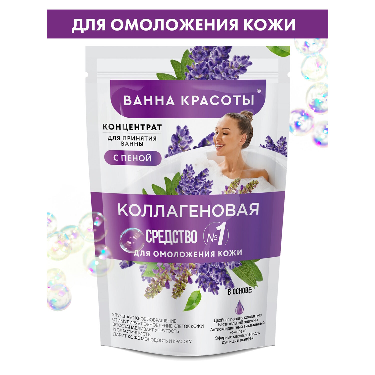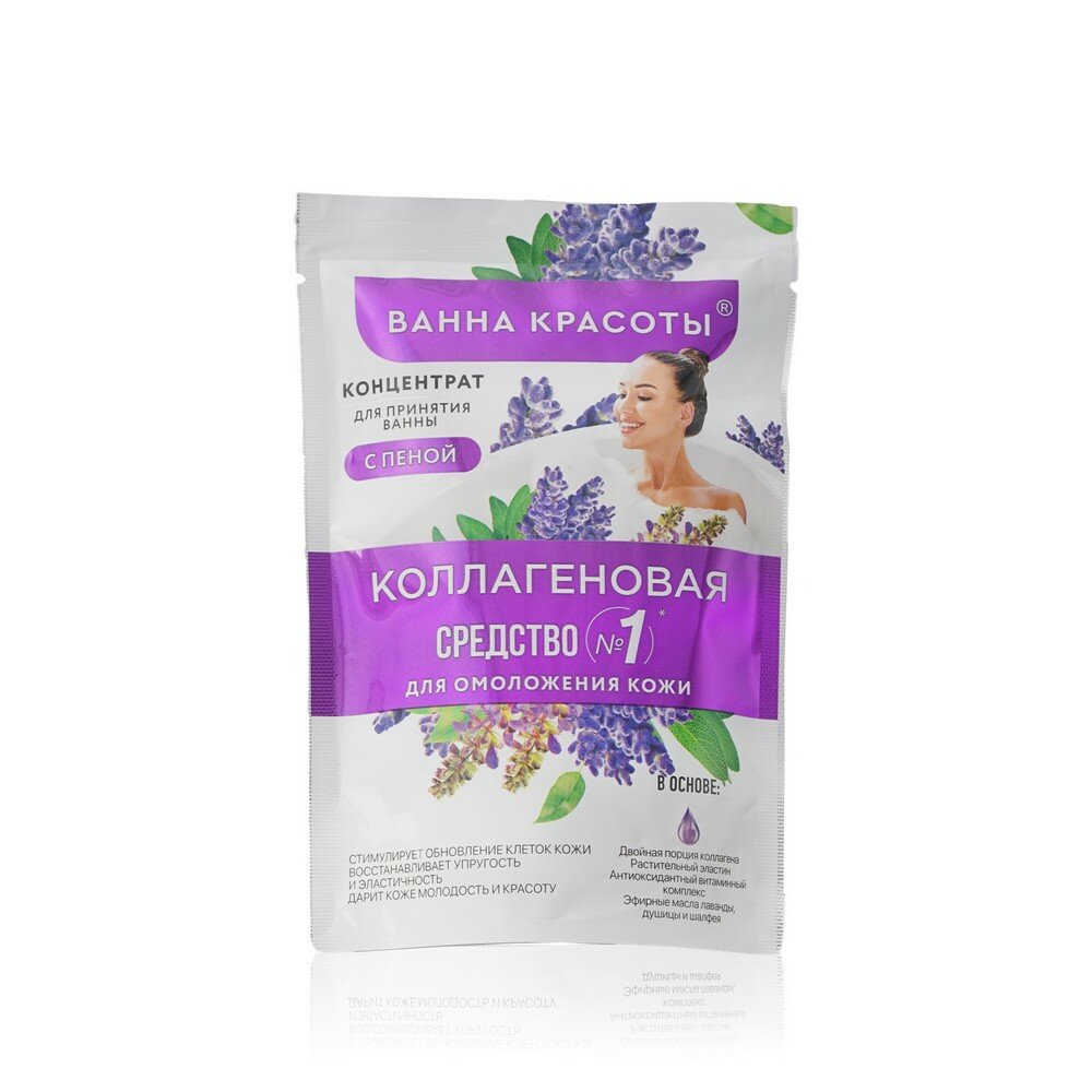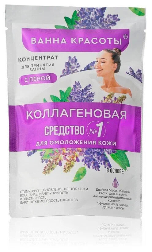 Коллагеновая ванна красоты – это интенсивная процедура для антивозрастного ухода за кожей. Коллагеновая ванна насыщает кожу витаминами и коллагеном, разглаживает и придает мягкость. Бонус – легкий цветочный аромат, пена и удовольствие от приема ванны. Натуральные коллаген и эластин восстанавливают кожу на клеточном уровне и замедляют процессы старения. Антиоксидантный витаминный комплекс глубоко питает кожу, тонизирует и придает гладкость. Эфирные масла лаванды, душицы и шалфея мягко ароматизируют воду и ухаживают за кожей.