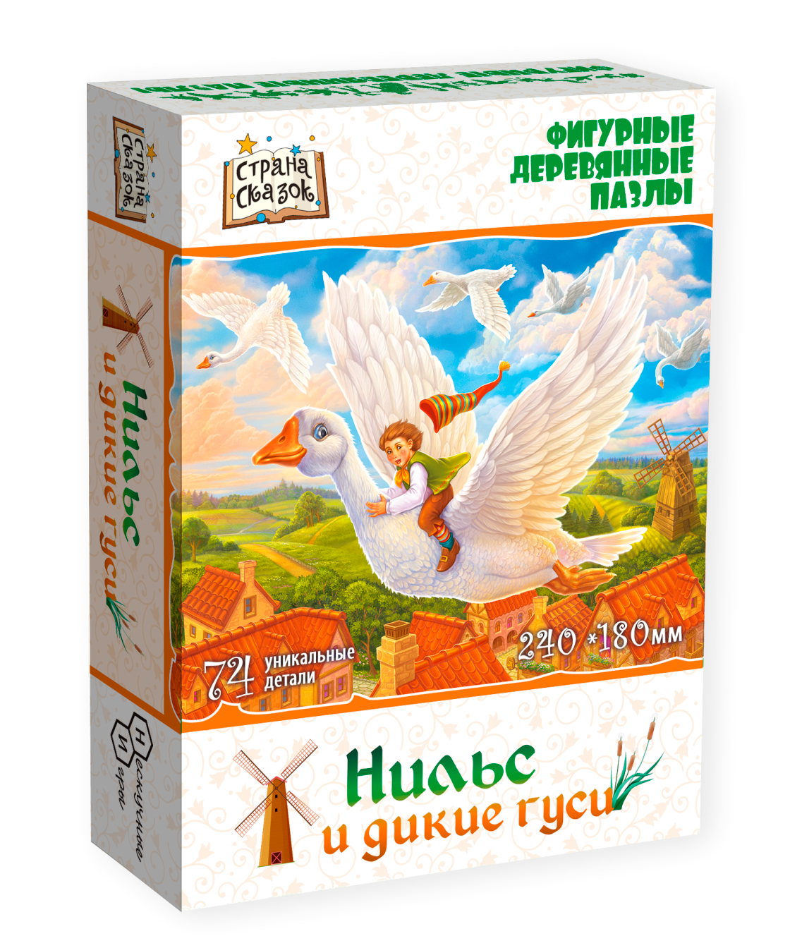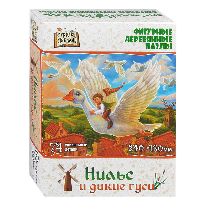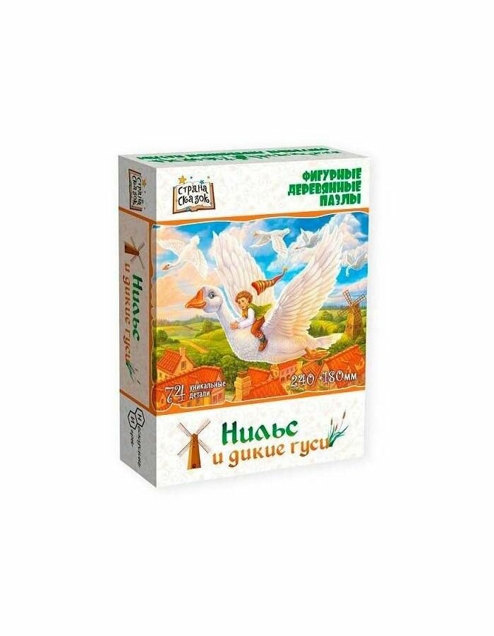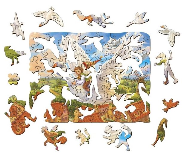 Фигурный деревянный пазл Нильс и дикие гуси это интересные пазлы необычной формы, которые понравятся как детям, так и родителям. Все детали имеют разную форму. При этом часть элементов выполнены в форме предметов, относящихся к теме основной картинки. Детали выполнены из фанеры. Изображение с помощью специального принтера нанесено прямо на дерево (самый прочный вариант).