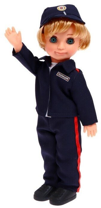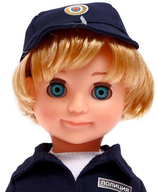 Кукла-мальчик Полицейский подойдет для различных сюжетно-ролевых игр, познакомит ребенка с работой сотрудника правопорядка. Комплект одежды куклы состоит из кепки, кофты, майки, брюк, кроссовок и трусиков, ткань - х/б. Ручки и голова куклы выполнены из пвх-пластизоли, тело и ножки - из пластика, волосы прошитые из нейлона, глаза вставные закрывающиеся, ручки и ножки подвижны. Игрушку можно садить, переодевать, придавать ей различные положения, что разнообразит игровые сюжеты.