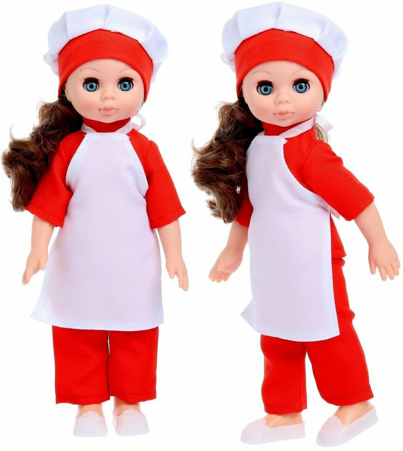 В комплект костюма повара входят колпак, фартук, кофта, брюки, туфли и трусики. Вся одежда сшита из х/б ткани, имитируя настоящую форму девочки повара. Рост куклы составляет 30 см. Волосы прошиты по всей головке, глаза вставные, закрывающиеся. Роспись лица выполнена вручную, присутствуют элементы нанесения аэрографом. Ручки и голова выполнена из ПВХ-пластизоля, а туловище и ножки из пластмассы. Кукла удобна в использовании, ручки и ножки можно поворачивать с легкостью. Ваш ребенок и кукла девочка Повар составит вам прекрасную компанию в готовке вкусной и полезной еды.