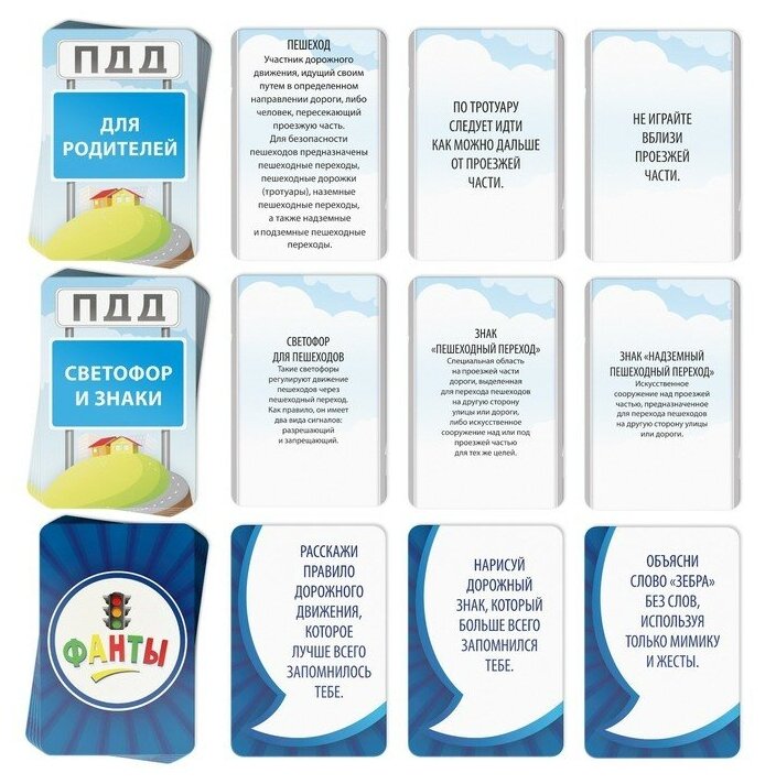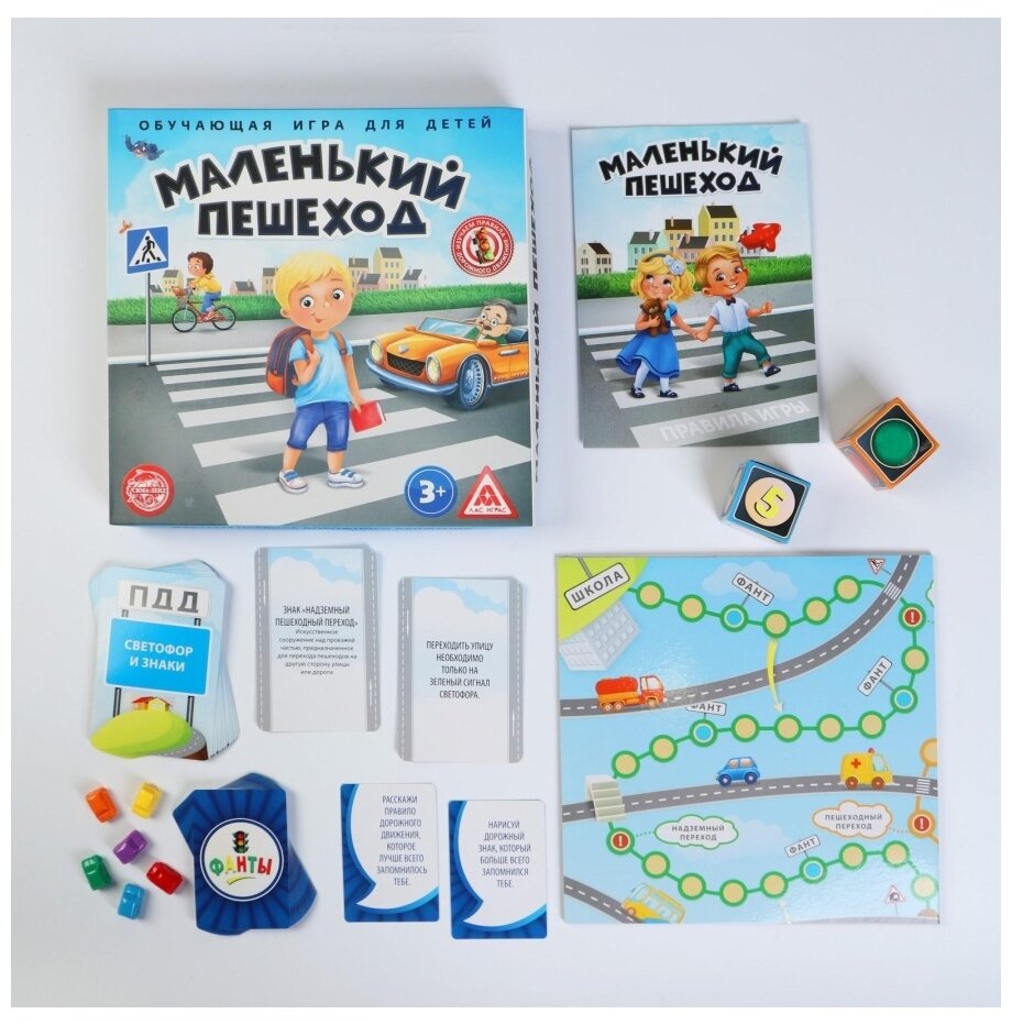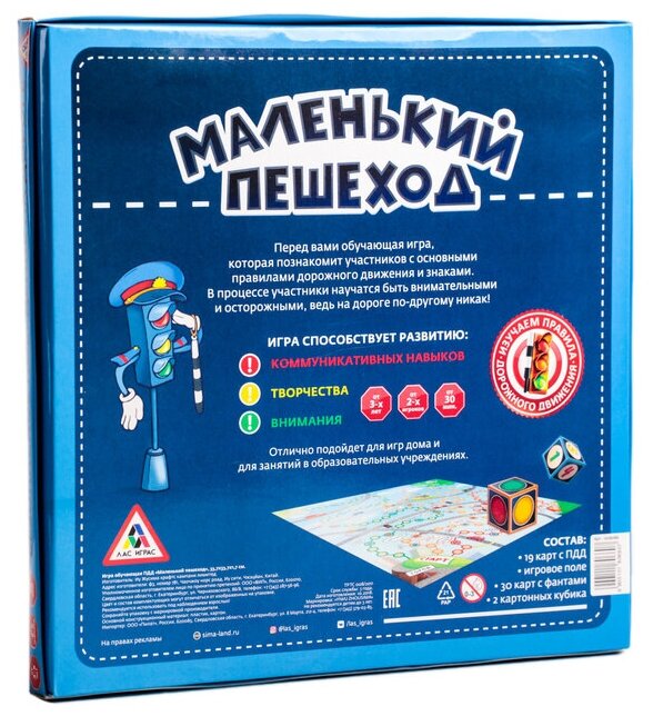 | Комплектация | игровое поле; картонные кубики - 2 шт; фишки - 6 шт; карточки с ПДД - 19 шт; фанты - 30 шт; инструкция |