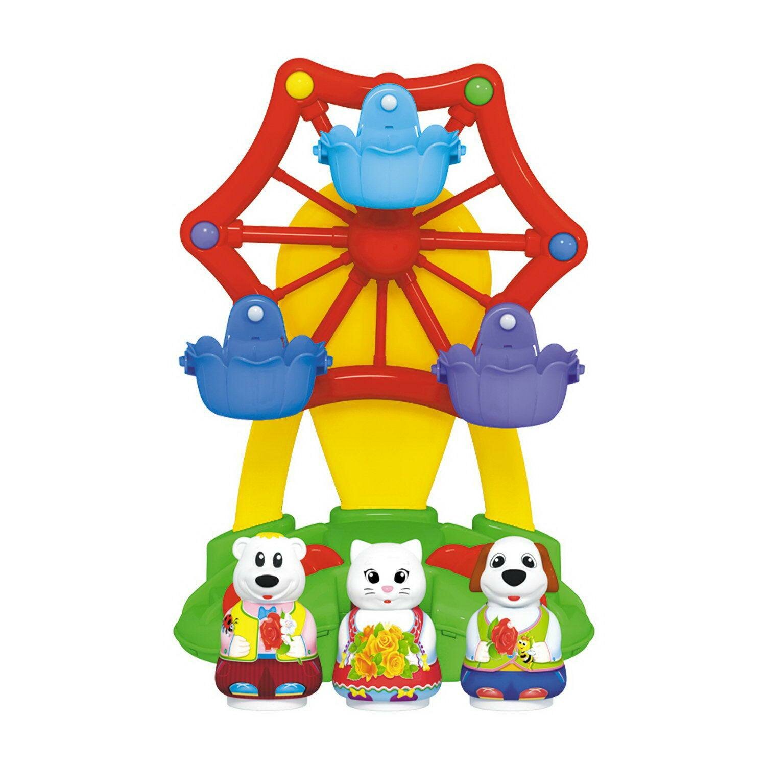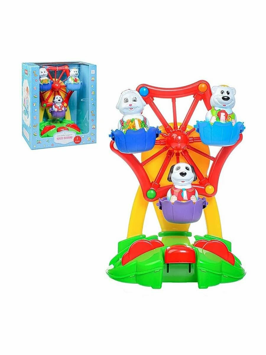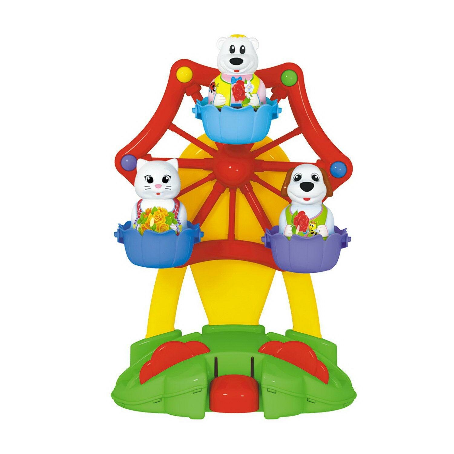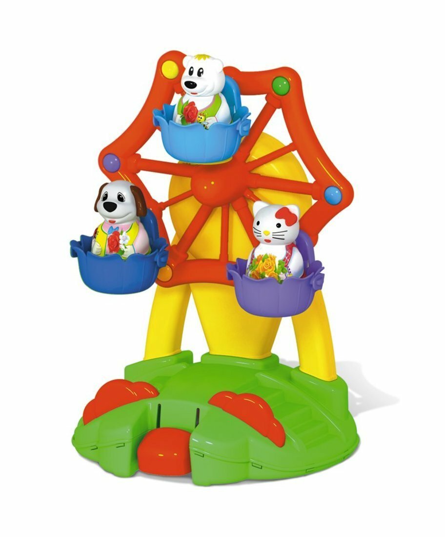 Колесо обозрения - один из самых любимых и популярных аттракционов среди детей! Парк развлечений дома? Это вполне реально!. Наша новая игрушка порадует и развеселит вашего малыша, ведь она выглядит совсем как настоящее колесо обозрения. Веселый аттракцион запускается лёгким нажатием клавиши. В кабинках колеса обозрения кружатся под задорную музыку три фигурки симпатичных животных. Они легко вынимаются и могут составить крохе компанию и в другой игре. Игрушечный аттракцион идеально подходит для самостоятельной игры, он выполнен из безопасного материала и не имеет мелких деталей. Подробны
