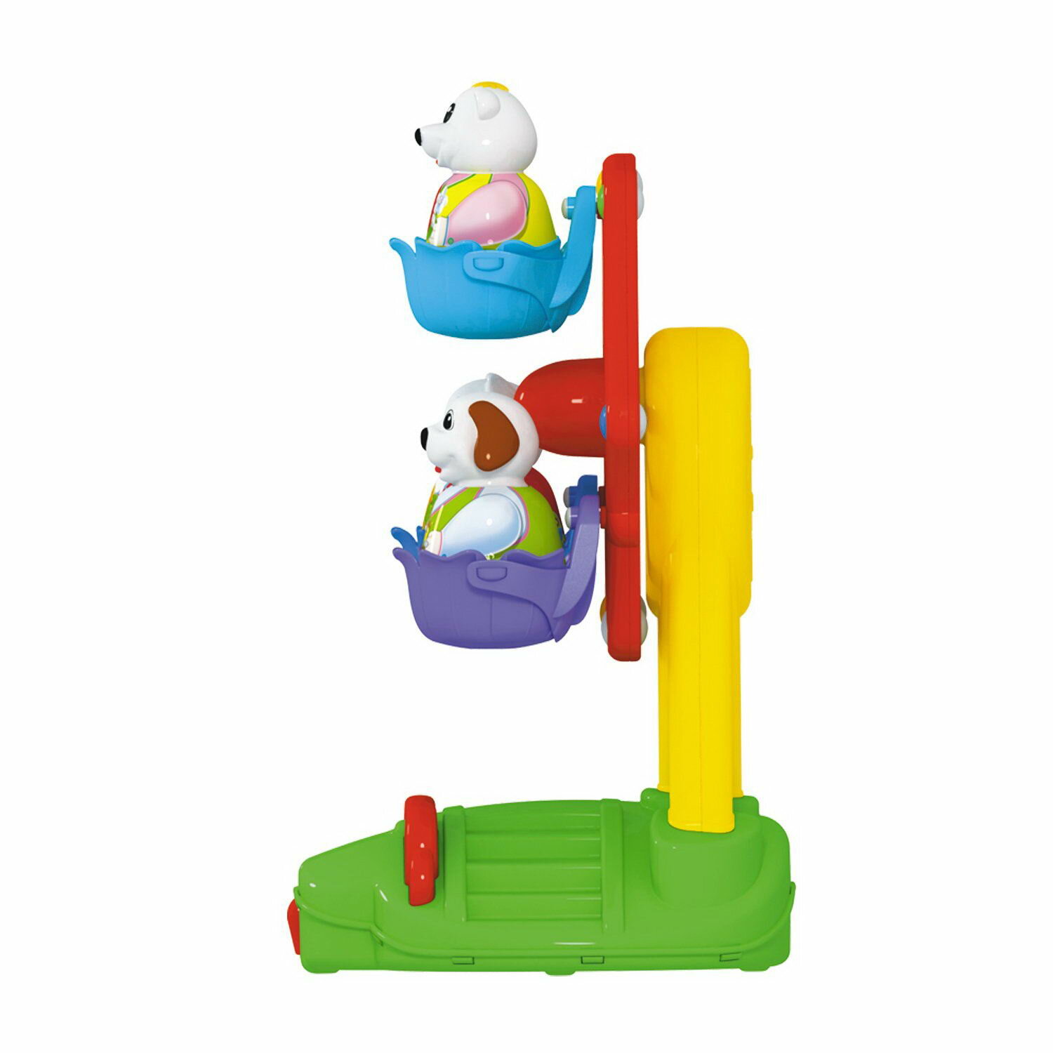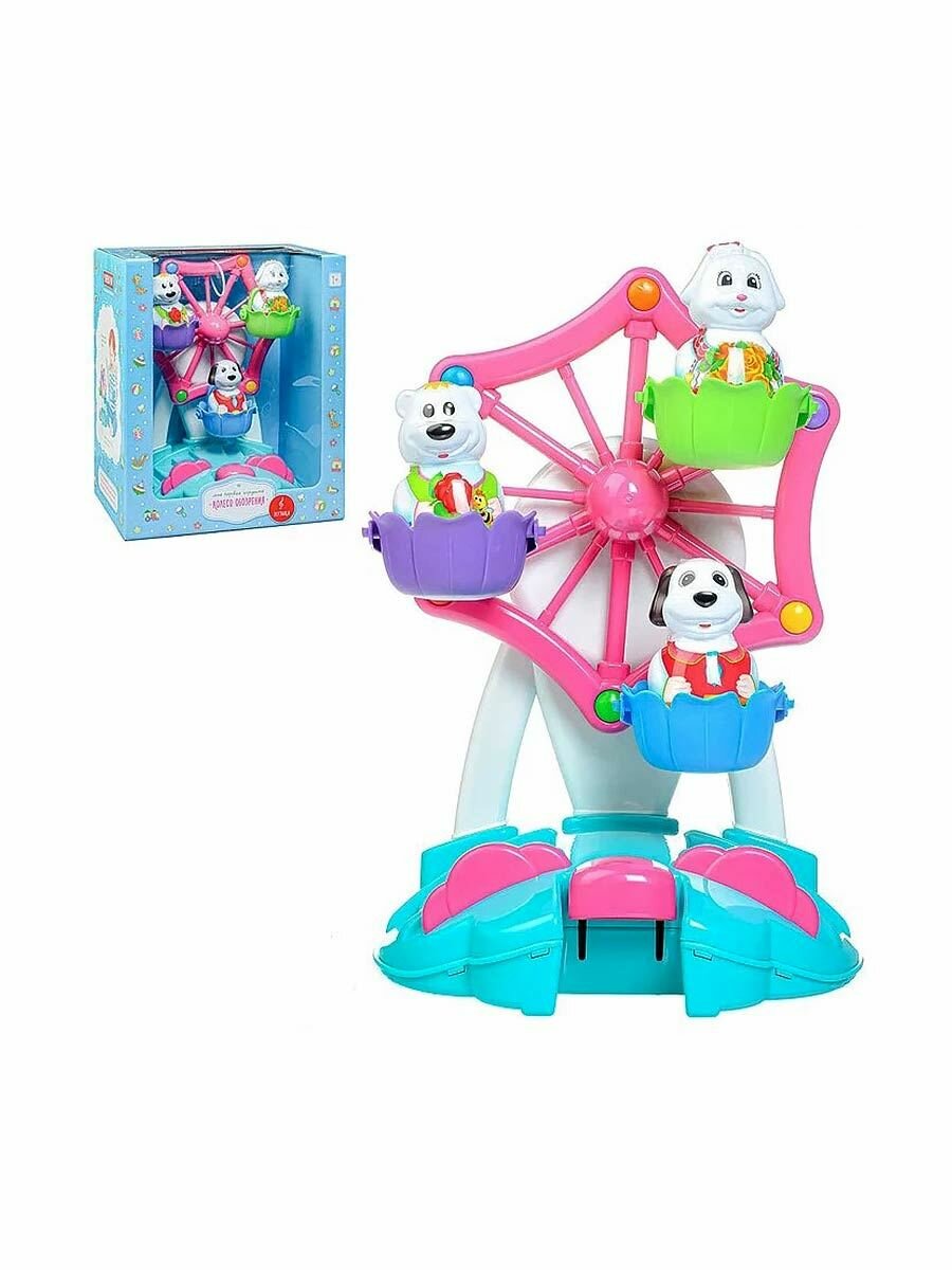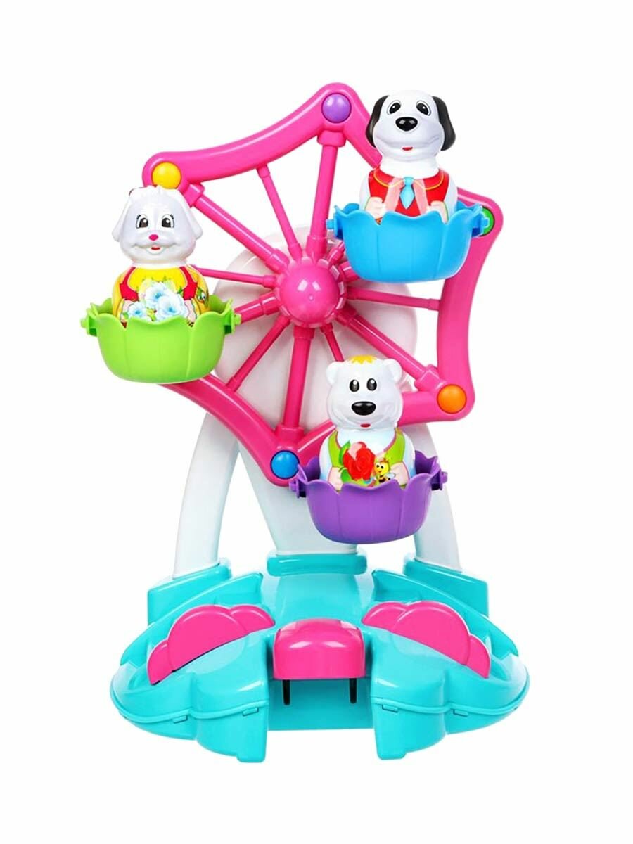 Колесо обозрения - один из самых любимых и популярных аттракционов среди детей! Парк развлечений дома? Это вполне реально!. Наша новая игрушка порадует и развеселит вашего малыша, ведь она выглядит совсем как настоящее колесо обозрения. Веселый аттракцион запускается лёгким нажатием клавиши. В кабинках колеса обозрения кружатся под задорную музыку три фигурки симпатичных животных. Они легко вынимаются и могут составить крохе компанию и в другой игре. Игрушечный аттракцион идеально подходит для самостоятельной игры, он выполнен из безопасного материала и не имеет мелких деталей. Подробны
