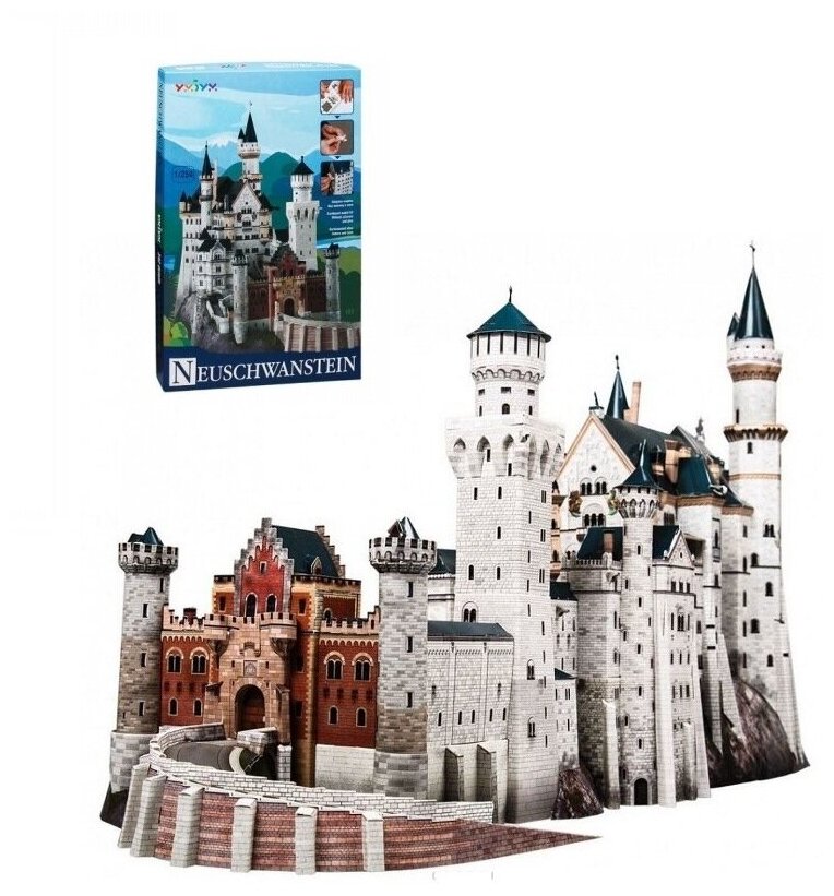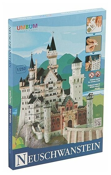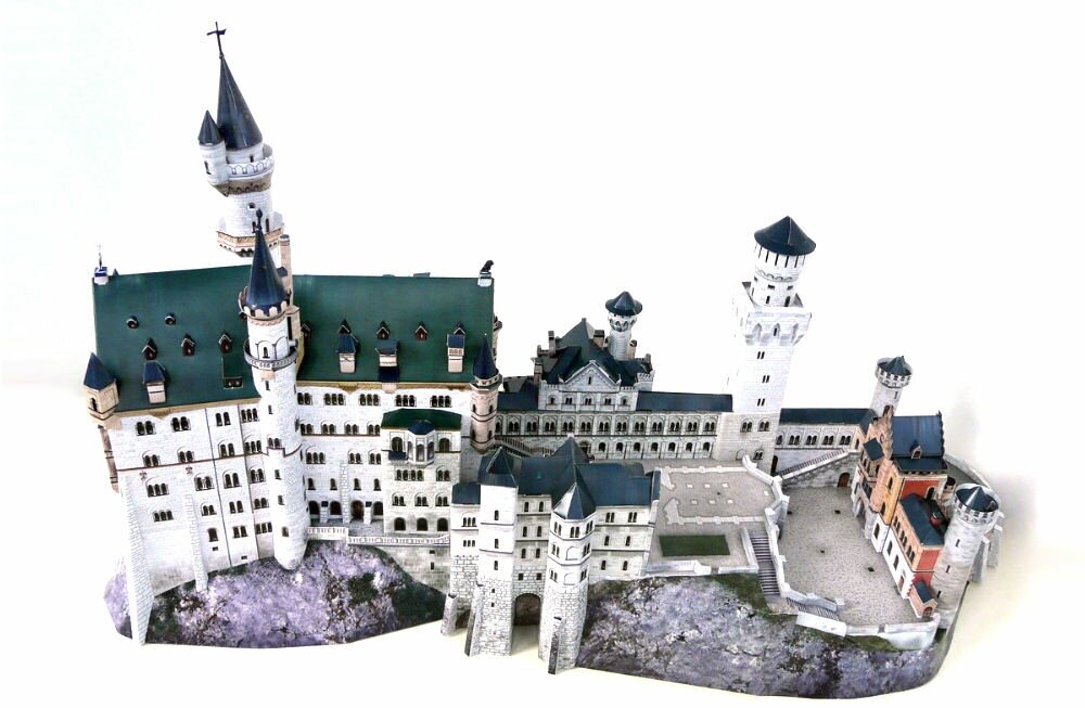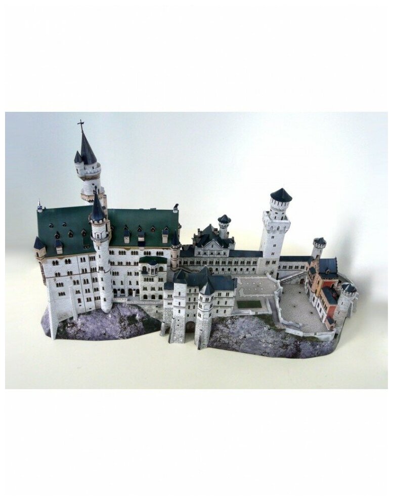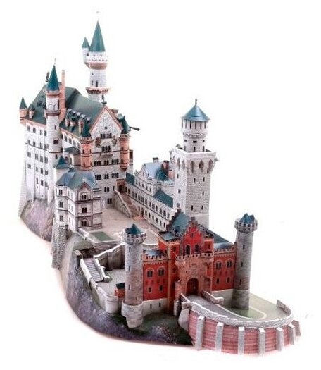 Картонная модель замка Нойшванштайн является одной из самых подробных масштабных моделей этого архитектурного чуда. Масштаб 1 к 250 означает, что модель в 250 раз меньше настоящего замка. Это модель для тех, кто понимает толк в аккуратной работе. Если поначалу вы отнесетесь к картону и его прочности с недоверием, то по мере сборки вы убедитесь, что картон — это удивительный материал с огромными возможностями. Для сборки модели не понадобятся режущие инструменты или клей. Детали уже вырезаны и нужно просто вынуть их из листа картона и соединить между собой. Картон, выбранный для этой модели — не самый толстый картон. Но это лучший материал для подобного моделирования. Где надо, он жесткий, где надо - гибкий. Позволяет выполнять из него не только граненые формы, но и плавно изгибать, скручивать в трубку, выполнять мелкие элементы. Этот картон справляется с любыми задачами. Выполнить что-то подобное из первого попавшего под руку картона вам не удастся. Мелкие детали постепенно сложатся в прочные формы, те соединятся между собой.. Процесс постройки неспешный и очень интересный. По окончании работ перед вами окажется жесткая и на удивление прочная модель. Собранная модель имеет в длину почти 70 сантиметров. Все мелочи тщательно продуманы, как снаружи, так и изнутри, включая башенки, лесенки и даже форму и расположение особых отверстий, о необходимости которых вы не раз задумаетесь, а потом оцените их полезность при сборке.