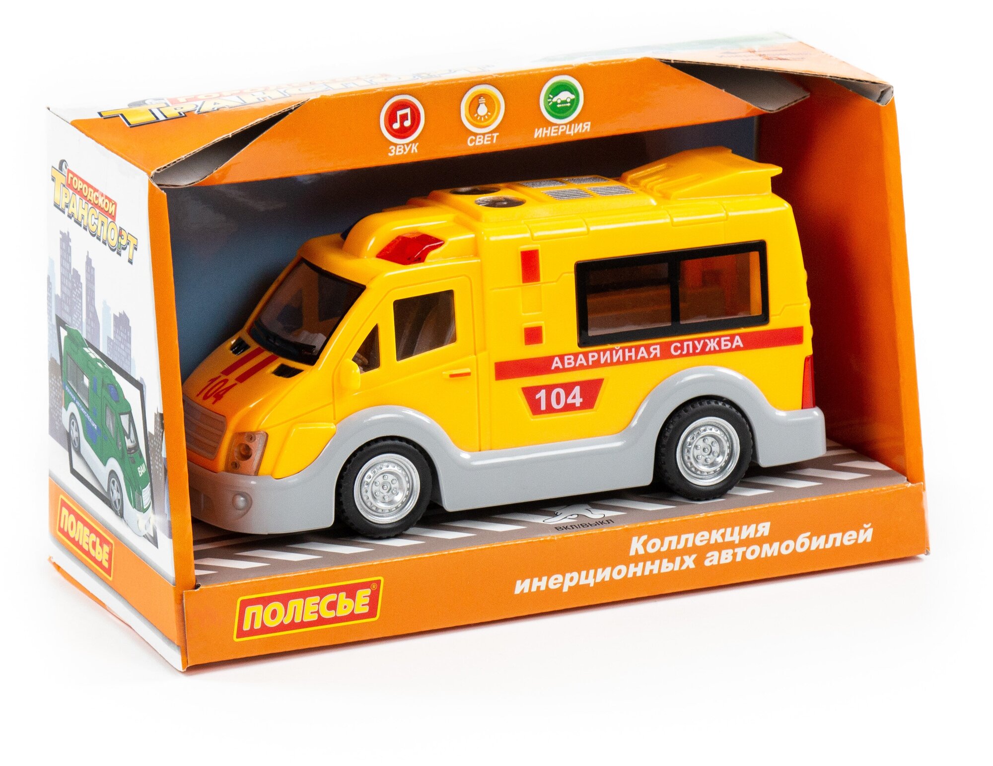 Аварийная служба, автомобиль инерционный (со светом и звуком) (в коробке) от фабрики «Полесье» имеет современный дизайн, соответствующий реальным аналогам транспорта. Игрушка выполнена из качественных материалов. Машинка оснащена инерционным механизмом и резиновыми колёсами, имеет звуковые и световые эффекты. Собери свой автопарк с коллекцией машинок «Городской транспорт» от фабрики «Полесье»
