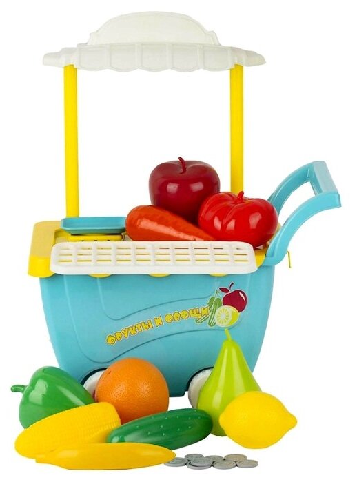 | Комплектация | тележка, монеты 1 комплект, яблоко, банан, апельсин, груша, помидор, огурец, морковь, перец, кукуруза, лимон |