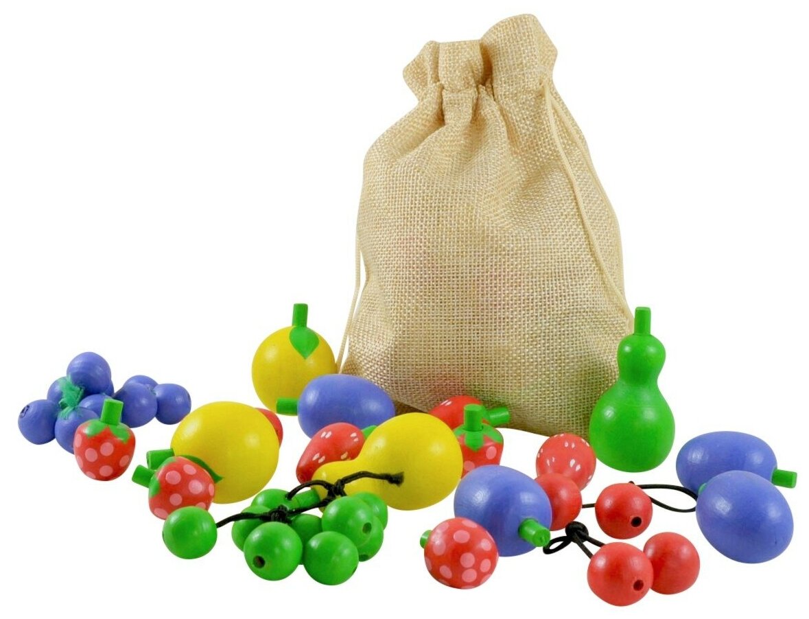 Замечательный многофункциональный набор. Можно готовить фрукты в игрушечной посуде, кормить кукол, считать и изучать цвета. Прокрашено идеально - дети играют уже несколько лет и набор все еще как новенький! Очень интересно и необычно выглядят виноград и вишни с веревочками (у детей они пользуются наибольшей популярностью). А еще можно использовать деревянные фрукты как образец для лепки фруктов пластилиновых.