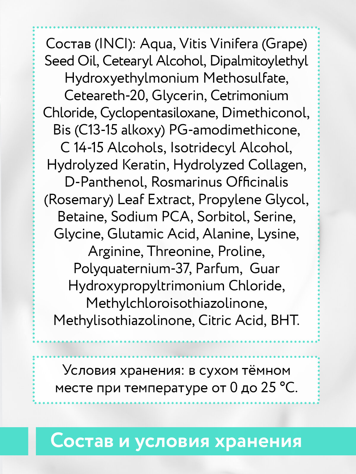 | Состав | aqua, vitis vinifera (grape) seed oil, cetearyl alcohol, dipalmitoylethyl hydroxyethylmonium methosulfate, ceteareth-20, glycerin, cetrimonium chloride, cyclopentasiloxane, dimethiconol, bis (c13-15 alkoxy) pg-amodimethicone, c 14-15 alcohols, isotridecyl alcohol, hydrolyzed keratin, hydrolyzed collagen, d-panthenol, rosmarinus officinalis (rosemary) leaf extract, propylene glycol, betaine, sodium pca, sorbitol, serine, glycine, glutamic acid, alanine, lysine, arginine, threonine, proline, polyquaternium-37, parfum, guar hydroxypropyltrimonium chloride, methylchloroisothiazolinone, methylisothiazolinone, citric acid, внт |