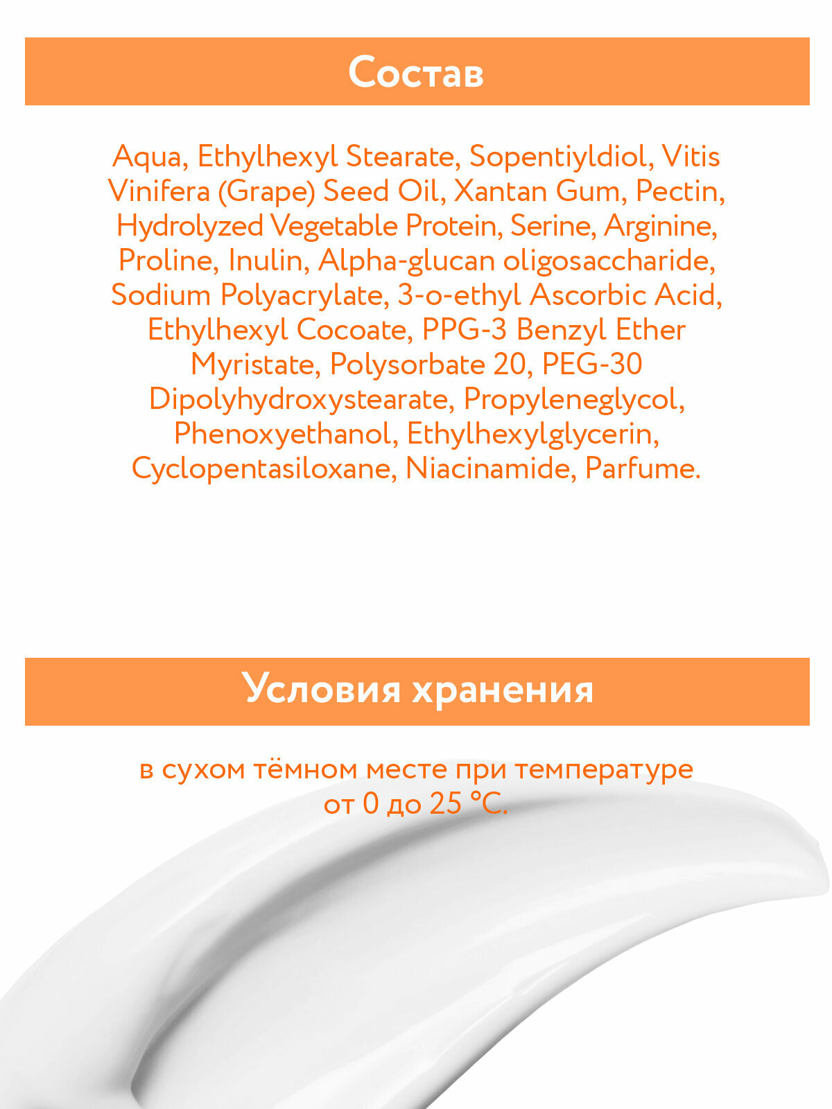 | Состав | Aqua, Ethylhexyl Stearate, Isopentiyldiol, Vitis Vinifera (Grape) Seed Oil, Xantan Gum, Pectin, Hydrolyzed Vegetable Protein, Serine, Arginine, Proline, Inulin, Alpha-glucan oligosaccharide, Sodium Polyacrylate, 3-o-ethyl Ascorbic Acid, Ethylhexyl Cocoate, PPG-3 Benzyl Ether Myristate, Polysorbate 20, PEG-30 Dipolyhydroxystearate, Propyleneglycol, Phenoxyethanol, Etylhexylglycerin, Cyclopentasiloxane, Niacinamide, Parfum. |