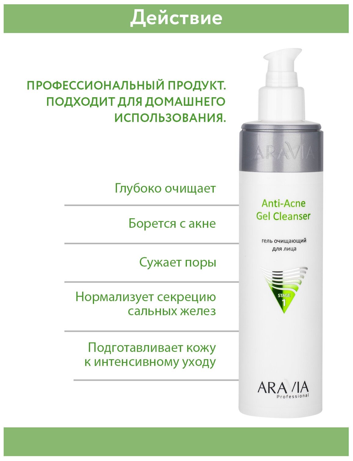 АRAVIA Professional Гель очищающий для жирной и проблемной кожи лица Anti-Acne Gel Cleanser, 250 мл Профессиональная формула очищающего геля разработана для глубокого и бережного удаления загрязнений, остатков макияжа и излишней сальности с поверхности жирной и проблемной кожи, склонной к появлению акне. Комплексное действие активных ингредиентов помогает нормализовать секрецию сальных желез, очищает поры, снимает жирный блеск, помогает восстановить естественный баланс микрофлоры кожи, подавляет размножение патогенных бактерий, вызывающих появление воспалений, черных точек и акне.