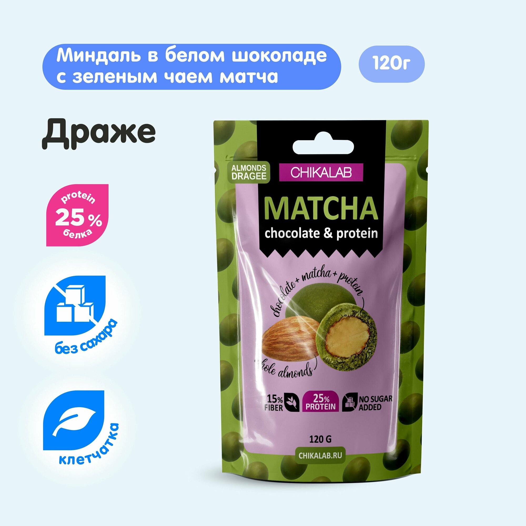 CHIKALAB Драже миндаль в белом шоколаде с зеленым чаем матча (без сахара) 120г 12шт